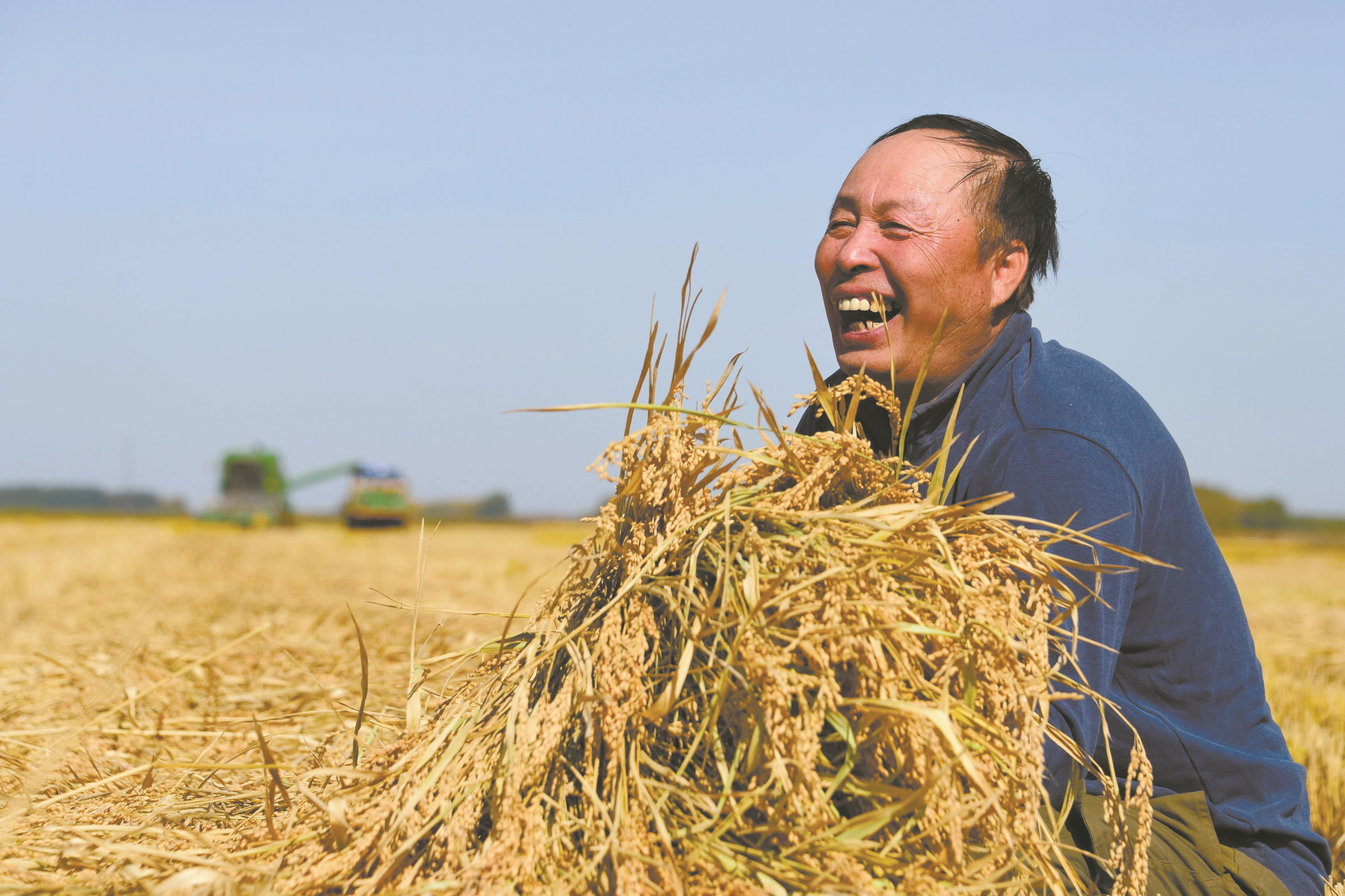 图为9月23日,在北大荒集团黑龙江绥滨农场有限公司红山管理区水田地块,种植户抱着收获的稻子。(新华社发)
