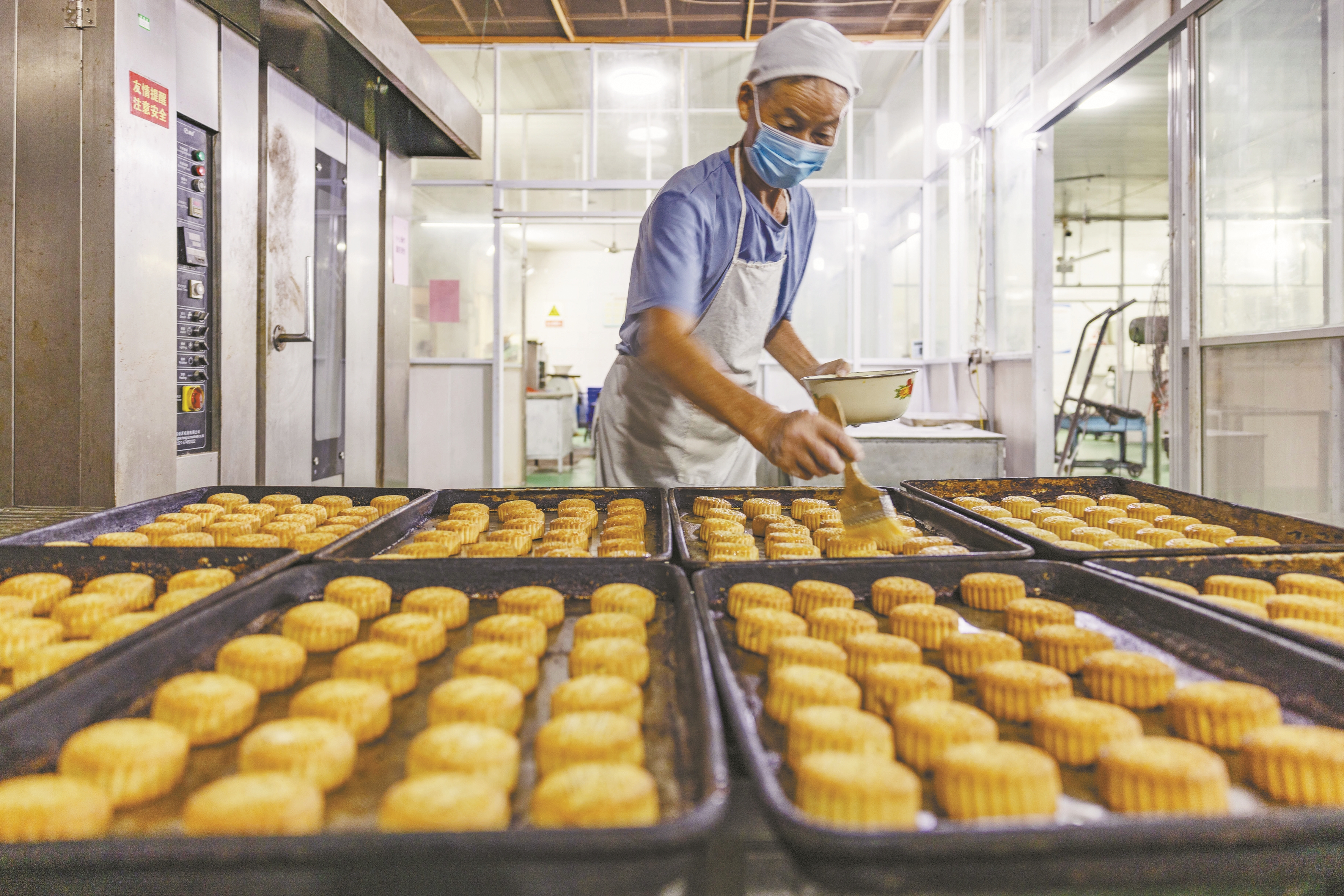 这是9月24日,工人在江苏省泰州市海陵区一家食品生产企业车间制作月饼。