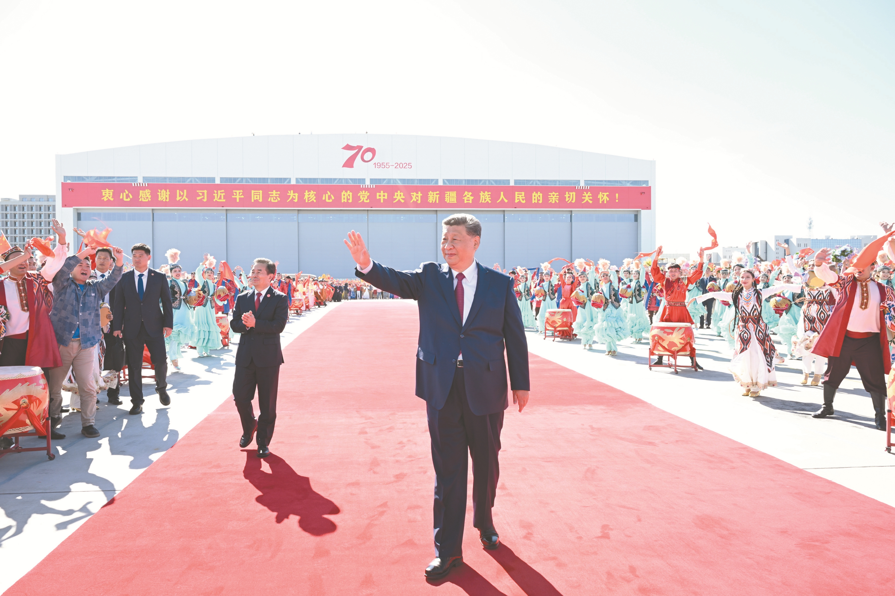 中共中央总书记、国家主席、中央军委主席习近平在乌鲁木齐出席新疆维吾尔自治区成立七十周年庆祝活动后,九月二十五日中午乘专机返回北京。这是习近平在乌鲁木齐天山国际机场向前来欢送的各族群众挥手致意。 新华社记者 谢环驰摄