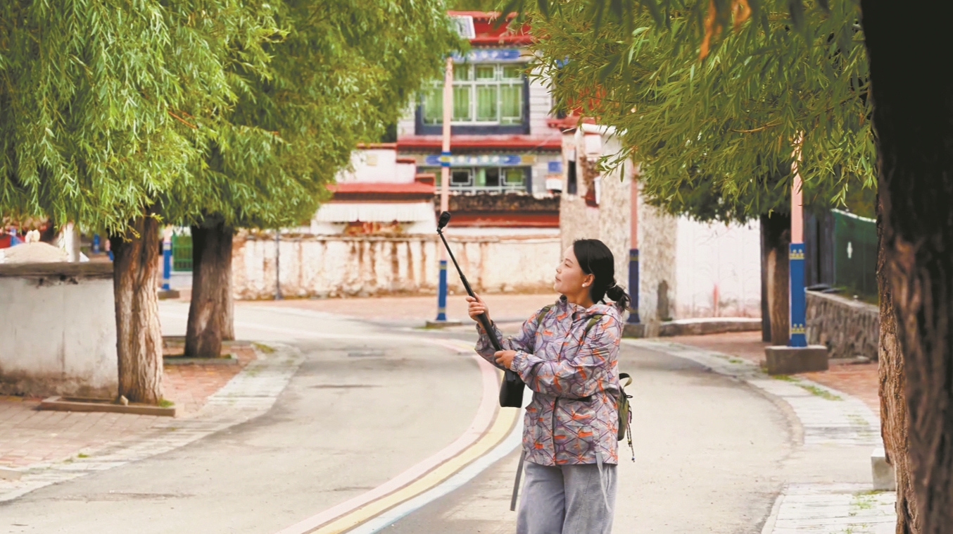 图为市民游客在塔巴村拍照定格美好瞬间。 拉萨融媒记者 莫瑞英摄