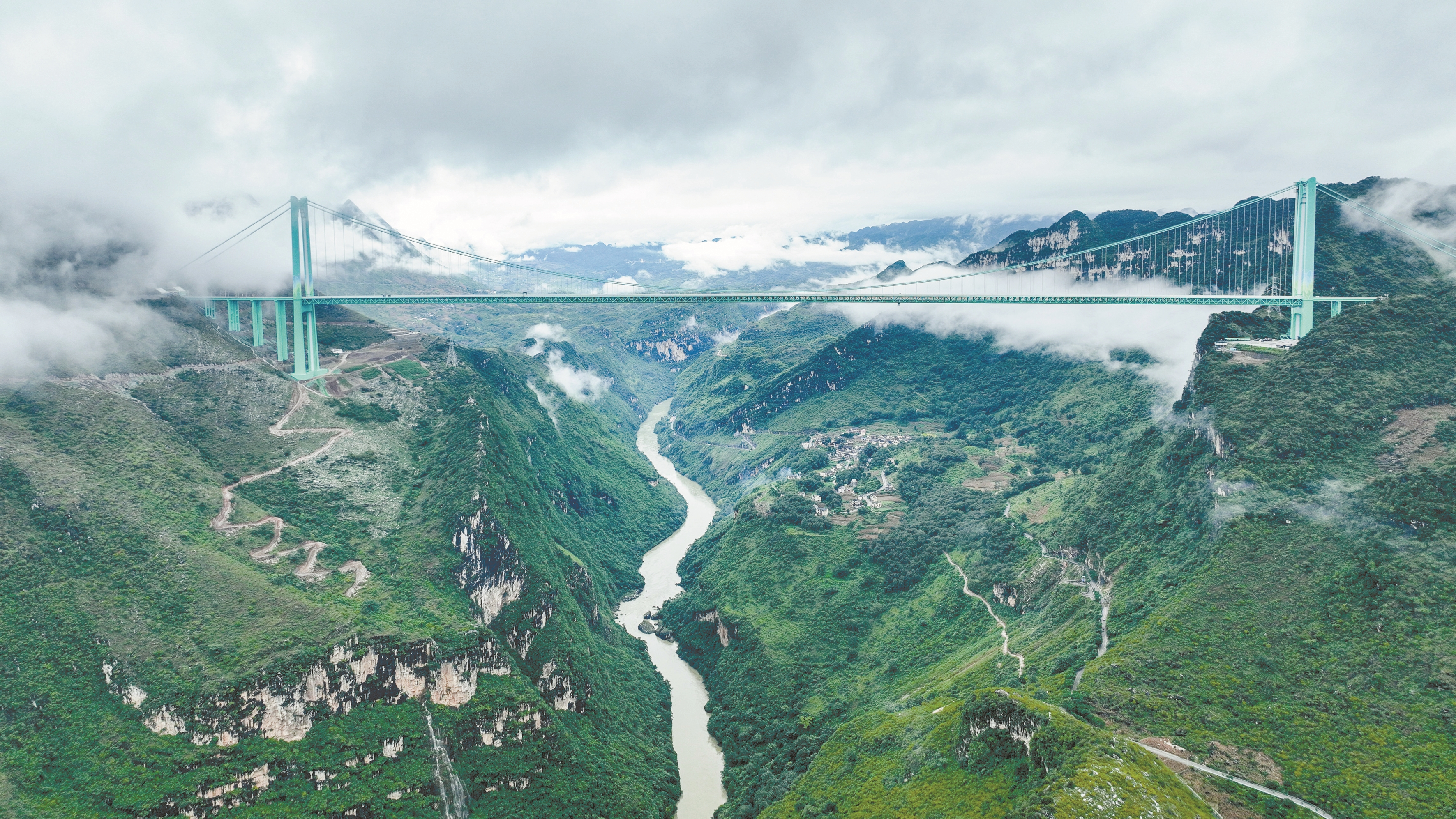 9月26日,雨后的贵州花江大峡谷云雾笼罩,花江峡谷大桥如同“钢铁巨龙”腾跃峡谷之上。花江峡谷大桥是贵州六枝至安龙高速公路的控制性工程,大桥全长2890米,主跨径1420米,是目前世界山区峡谷第一大跨度钢桁梁悬索桥;其桥面距水面垂直高度625米,是新的世界第一高桥。经过三年多建设,贵州花江峡谷大桥将于9月28日正式建成通车。