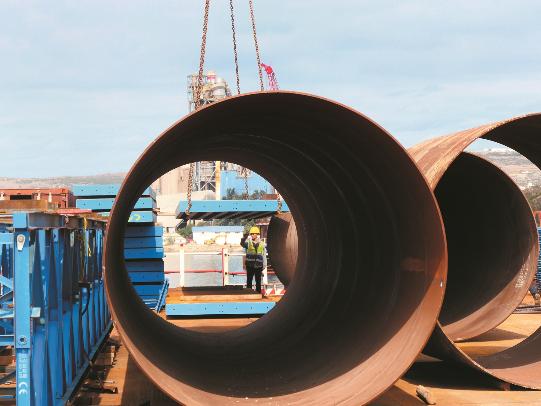 记者日前在大桥项目现场看到,陆上桩基工程大部分已完成,两条钢结构栈桥从比塞大运河南北两岸分别向水中延伸数十米,运输和安装大型钢筋笼和钢管的机械设备正忙碌地沿着栈桥开往水中作业平台,中国和突尼斯工人有条不紊地进行切割、焊接、吊装等工作,现场一派繁忙景象。