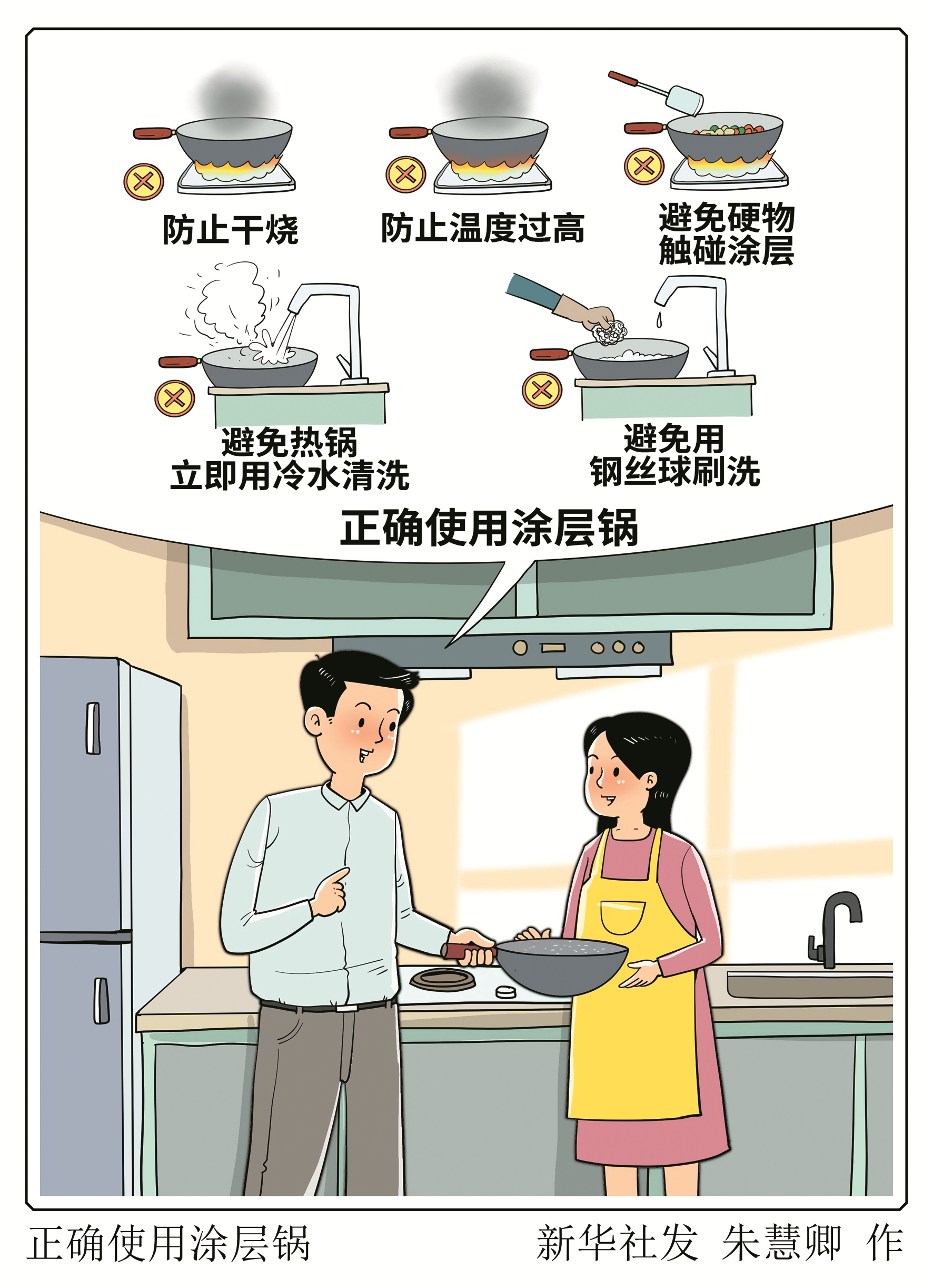正确使用涂层锅,消费者需要注意以下情况:一是防止干烧。空锅加热会使温度在短时间内快速上升,而每种涂层都有使用温度上限。二是防止温度过高。放油之后不要等冒油烟再放菜,过高温度会损害涂层。三是避免硬物触碰涂层。选用耐热的硅胶铲或木铲,避免使用金属铲,不烹制硬骨头、贝壳类、螃蟹类坚硬食材,防止刮伤涂层。四是避免热锅立即用冷水清洗。烹饪完成后,刚炒完菜的锅还处于高温膨胀状态,若立即加入冷水,热胀冷缩易导致变形或损坏。五是避免用钢丝球刷洗。清洗锅时,选用柔软的海绵或抹布清洗,防止破坏涂层。
