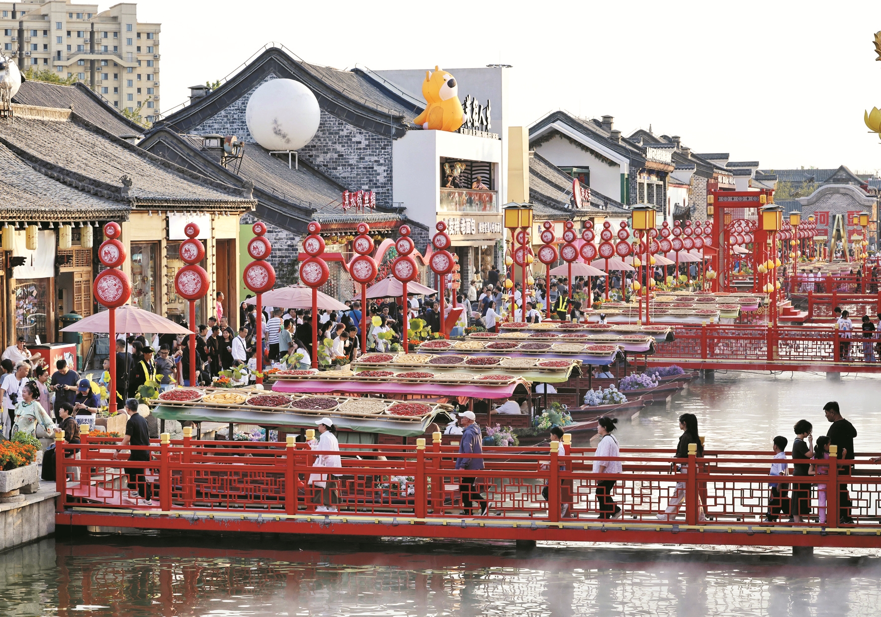 图为10月3日,游客在河北省唐山市丰南区河头老街景区游玩。