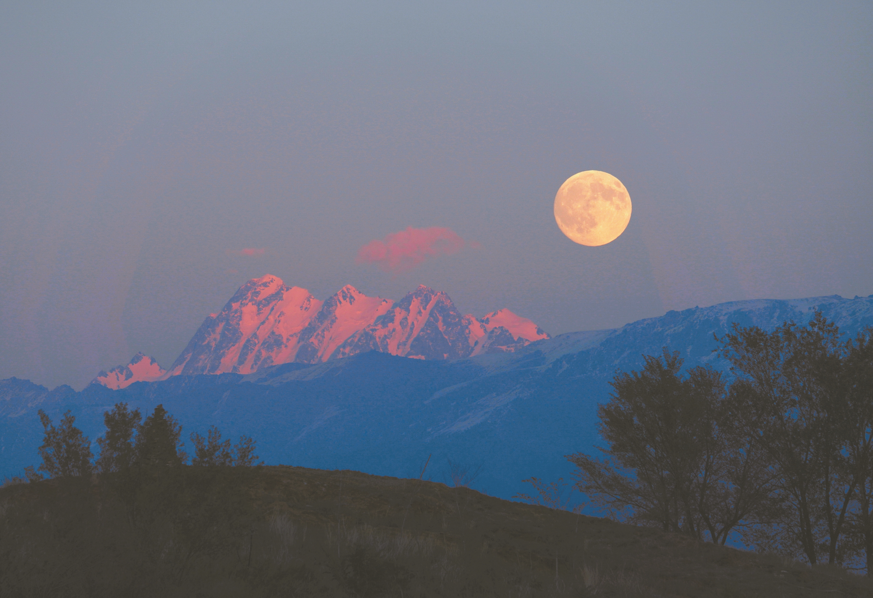→这是10月6日在新疆乌鲁木齐拍摄的天山山脉上空的中秋圆月。(新华社发)
