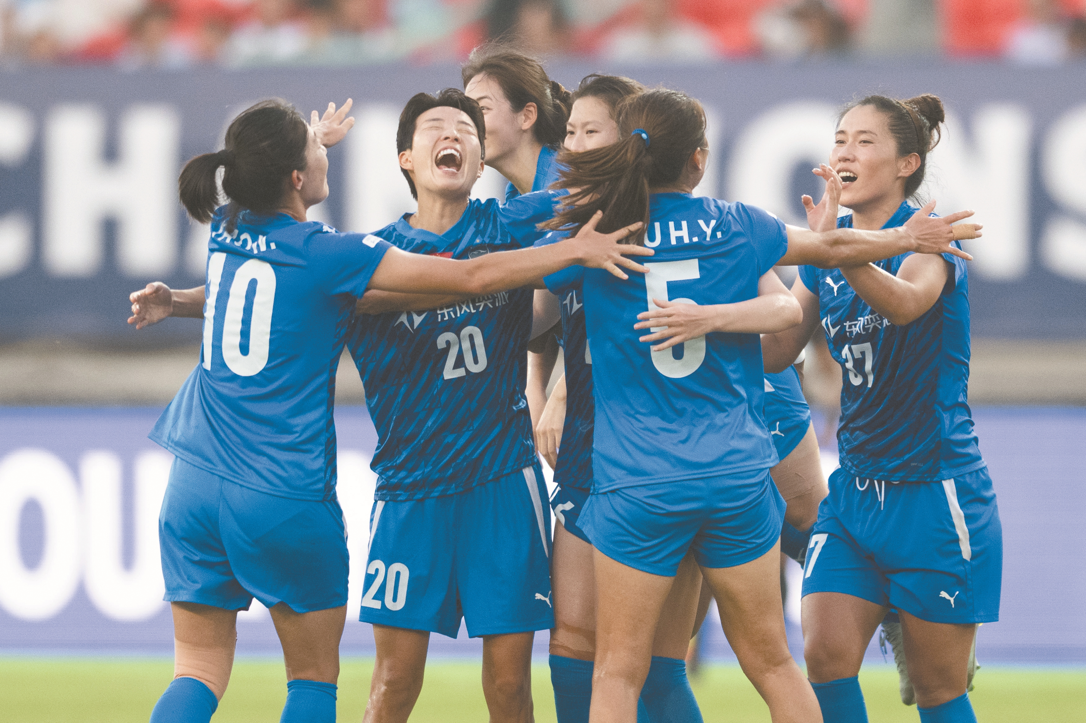 当日,武汉车谷江大队球员金慧利(左二)与队友庆祝球队得分。(新华社发)