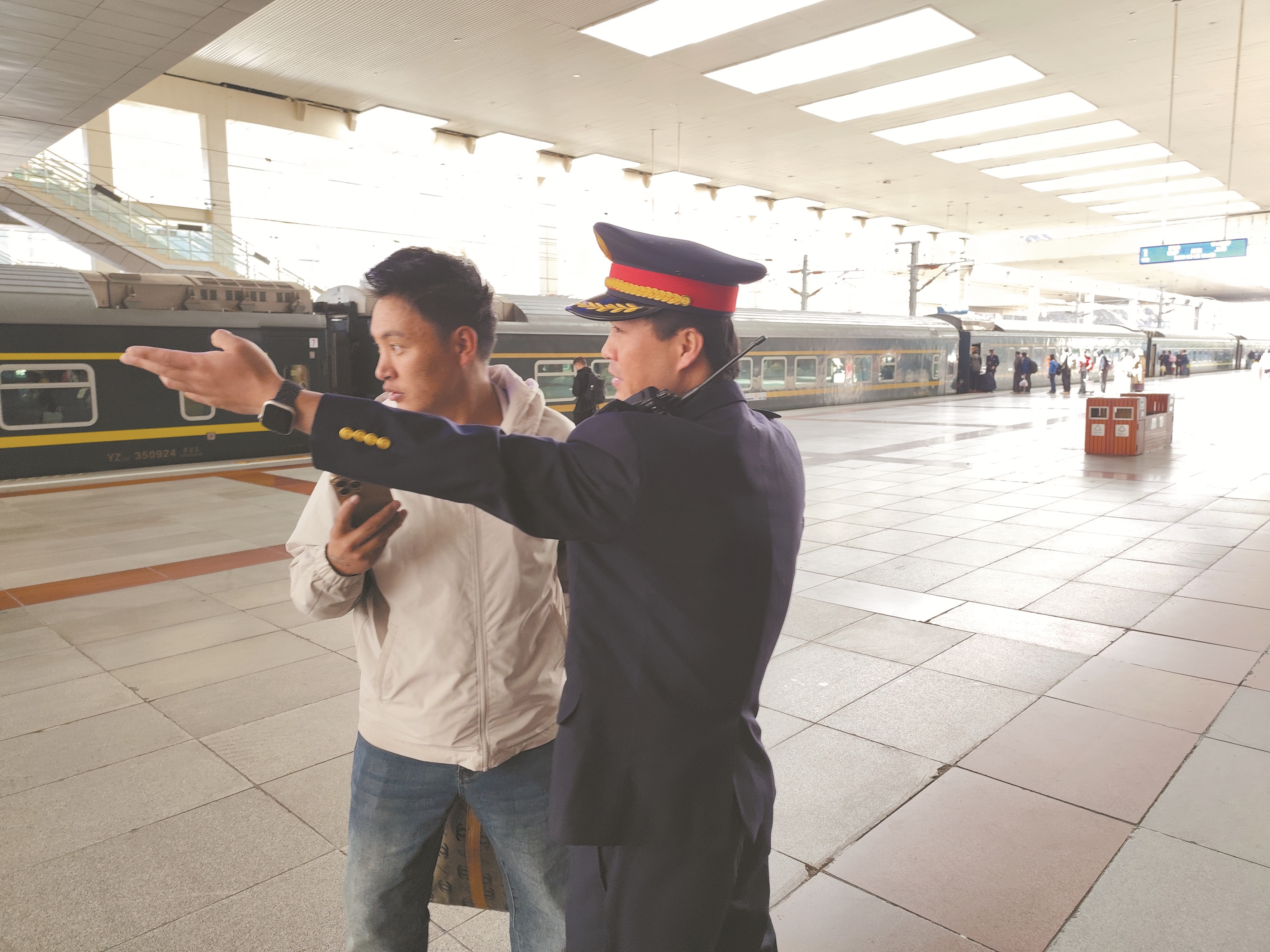 图为拉萨火车站工作人员为旅客讲解。 拉萨融媒记者 齐永昌摄