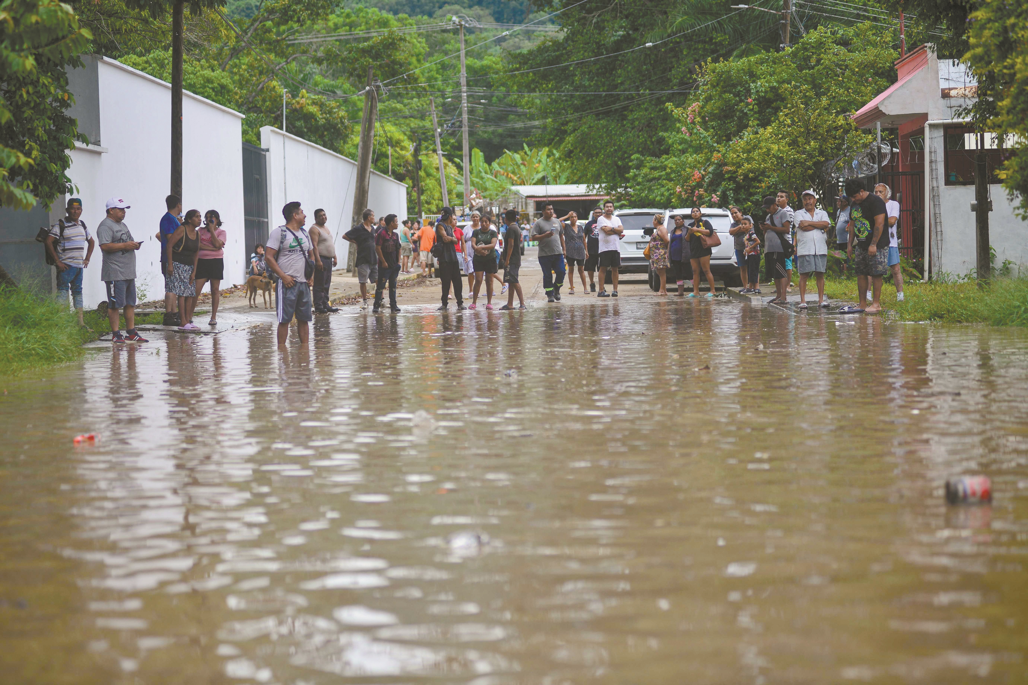 图为10月10日,在墨西哥韦拉克鲁斯州波萨里卡,人们站在被洪水淹没的街道旁。 (新华社发)