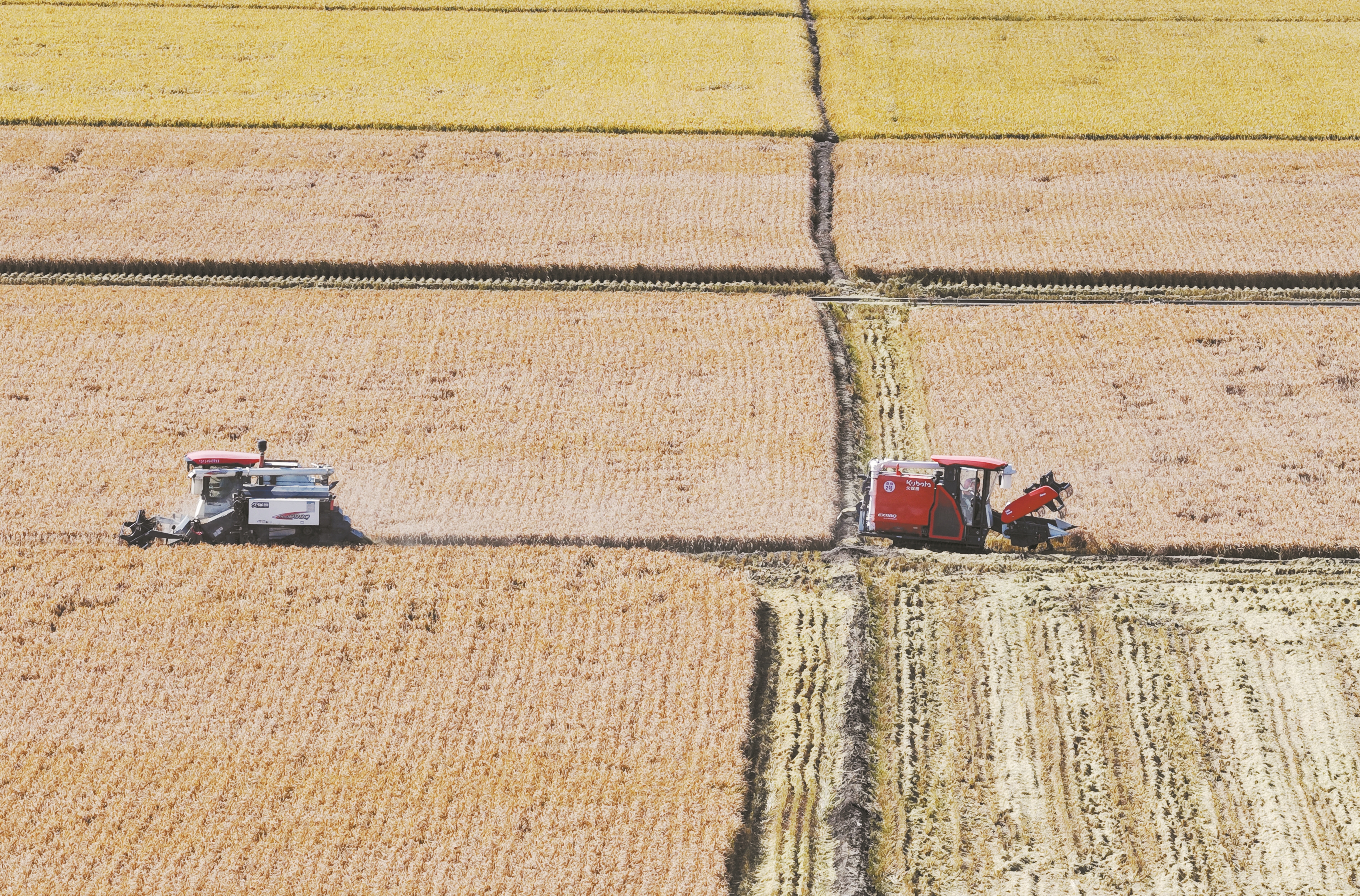 图为在位于黑龙江省双鸭山市的北大荒集团友谊农场有限公司,机械设备在进行水稻收获作业(9月23日摄)。(新华社发)