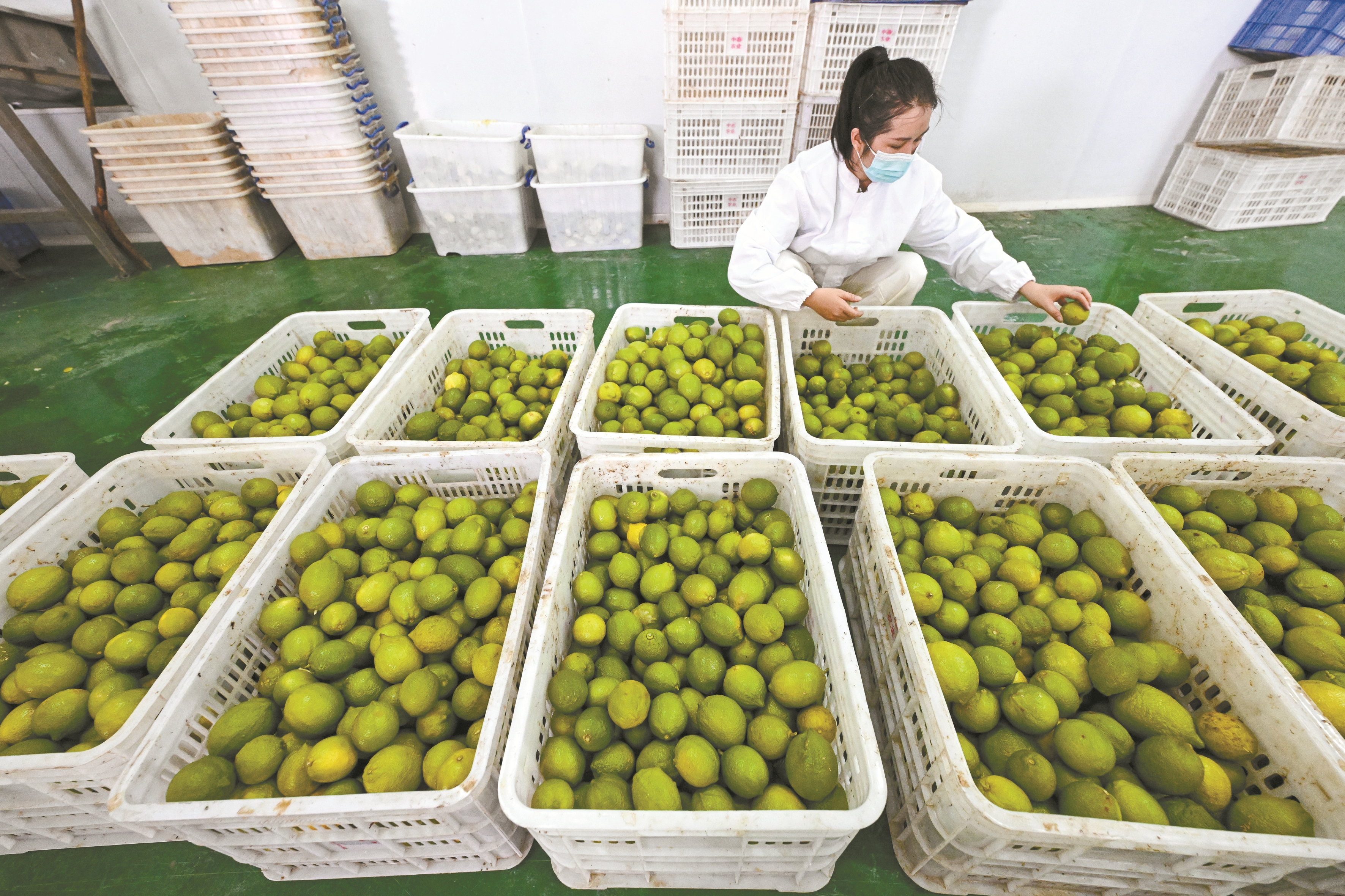 图为10月16日,工人在望谟县蔗香镇青柠檬现代产业园的生产车间分拣柠檬。