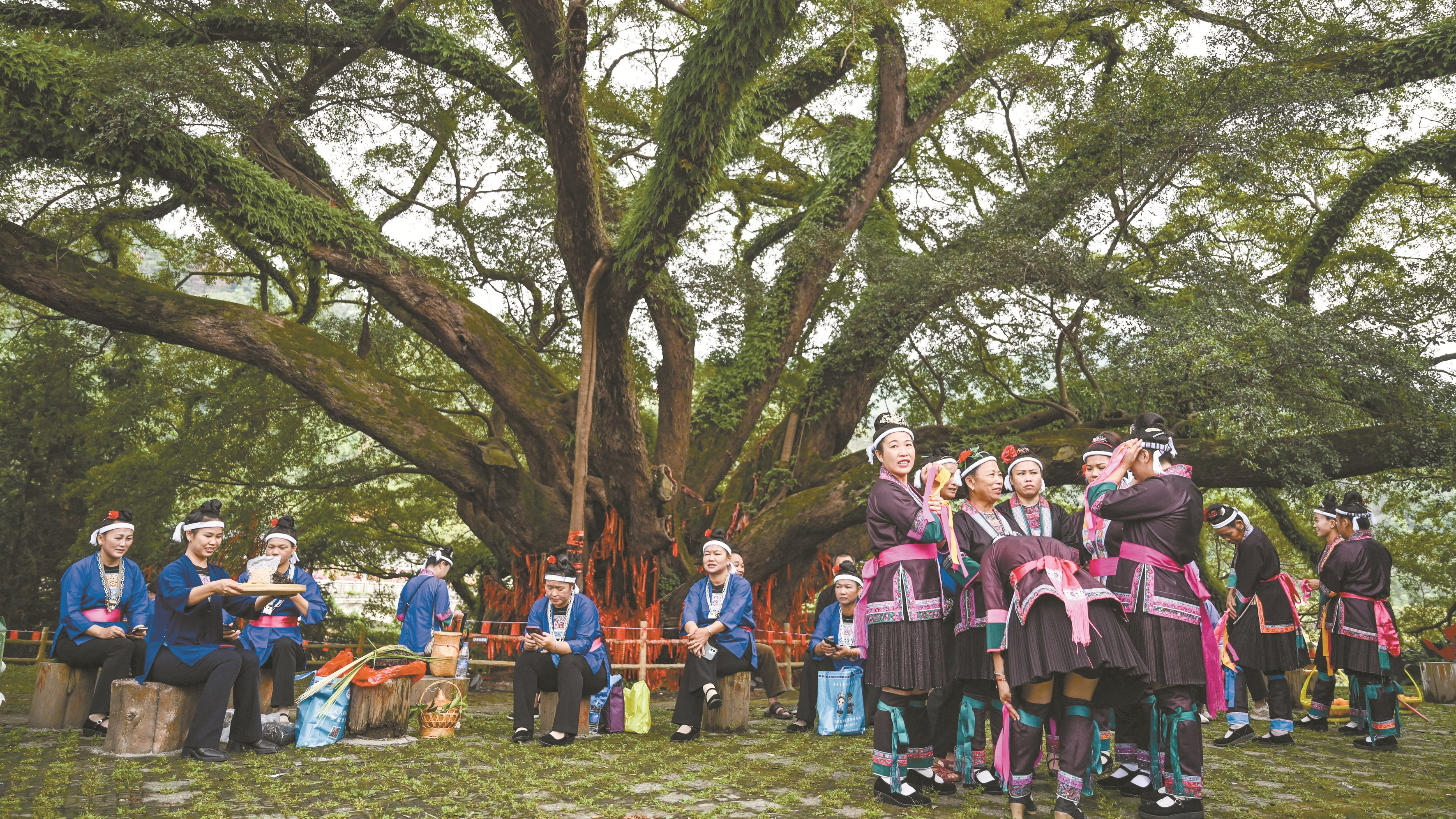 图为侗族群众聚集在良口乡产口村的古榕树下,为展演做准备。