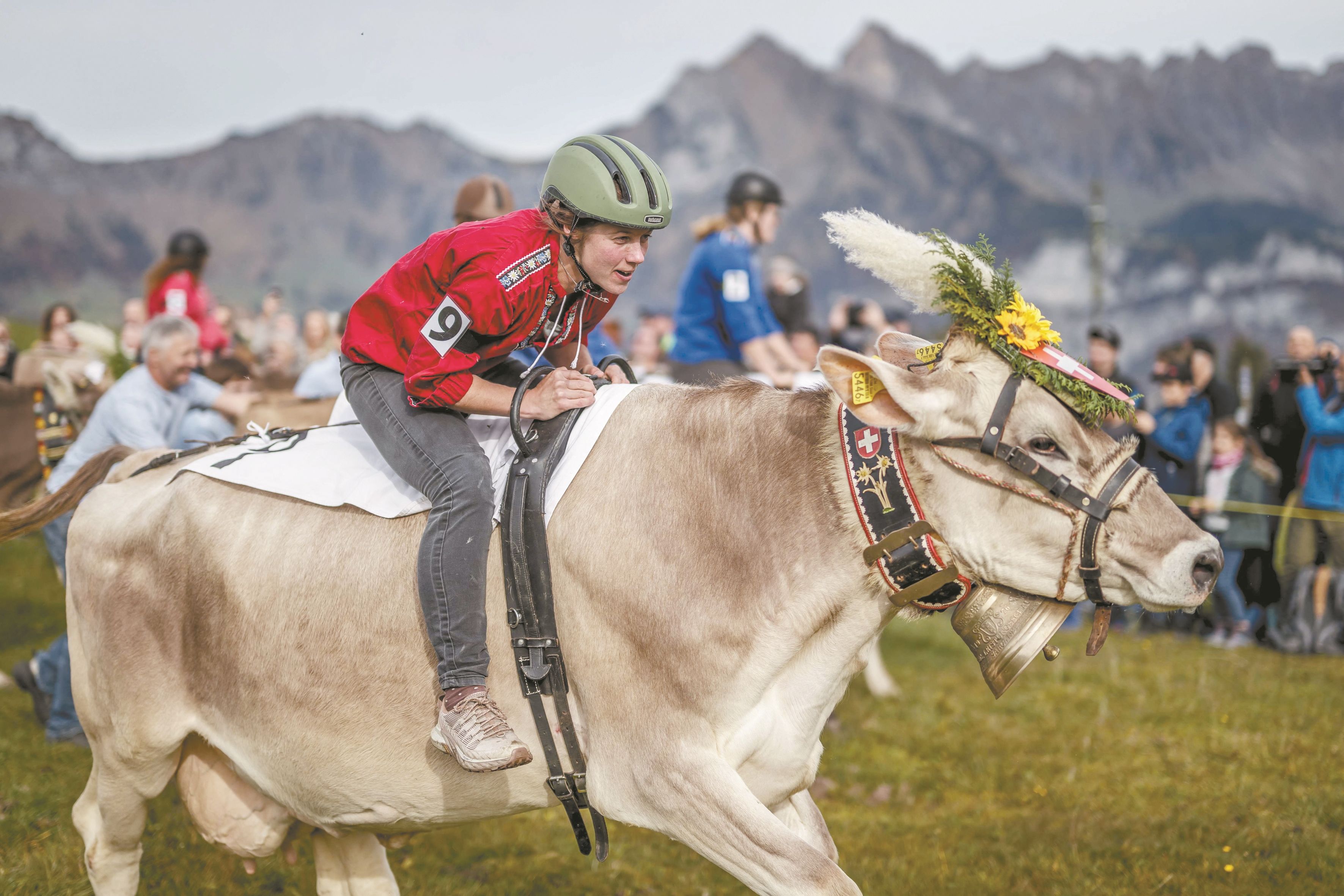 10月19日,位于瑞士阿尔卑斯山区的弗鲁姆塞尔贝尔格举办骑母牛大奖赛,该比赛只允许女骑手参赛。