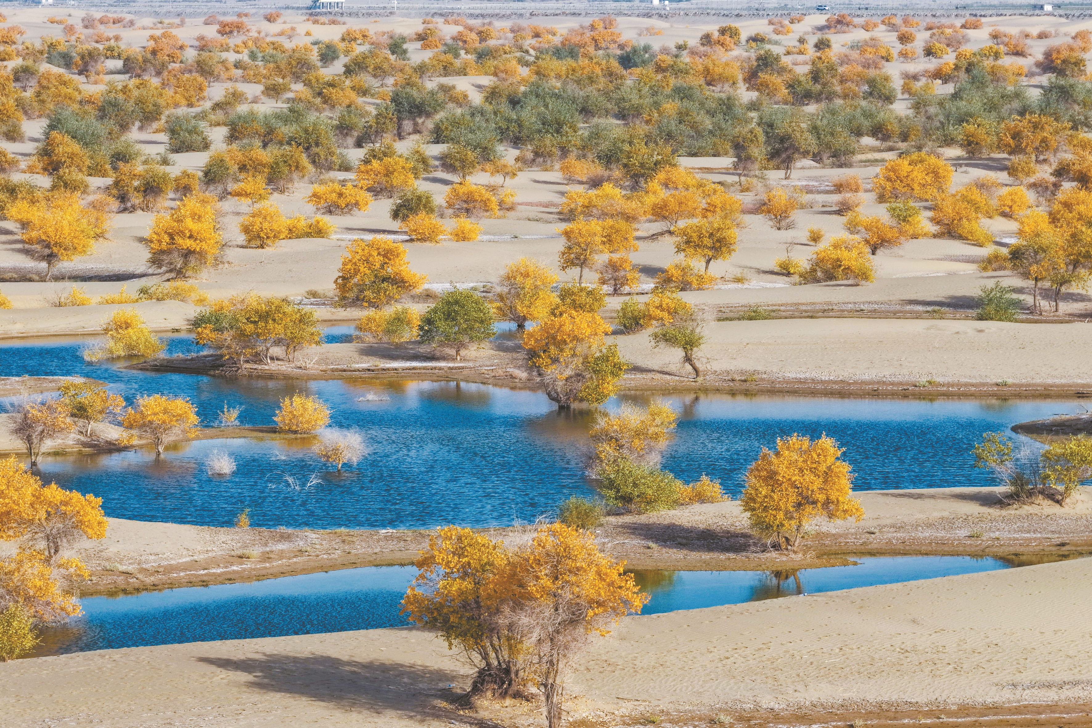 时下,新疆和田地区的胡杨迎来最佳观赏期,成片换妆的胡杨林与水天相映,共绘金秋美景。