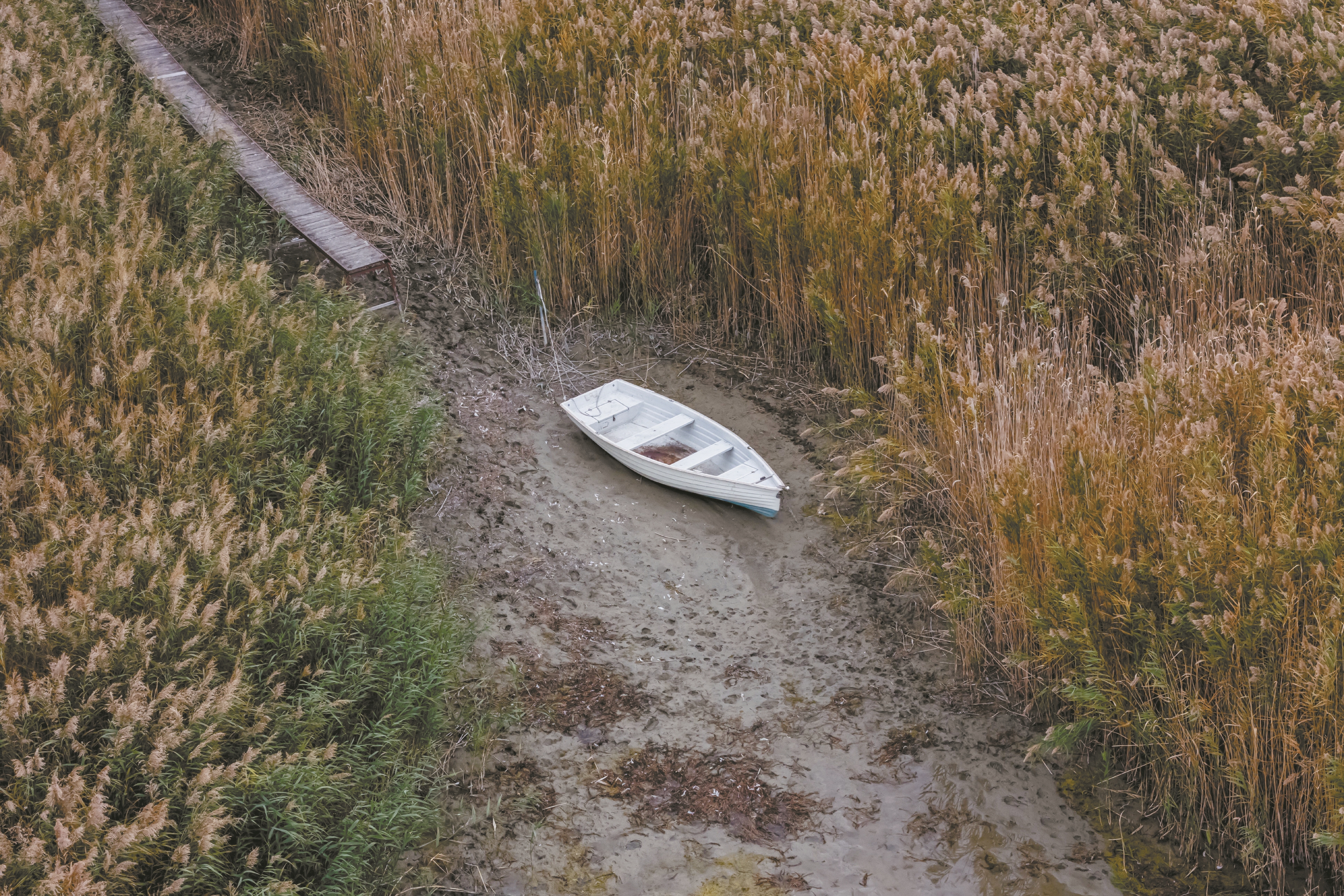 图为10月21日,在匈牙利巴拉顿费尼韦斯,一艘船搁浅在巴拉顿湖湖底(无人机照片)。