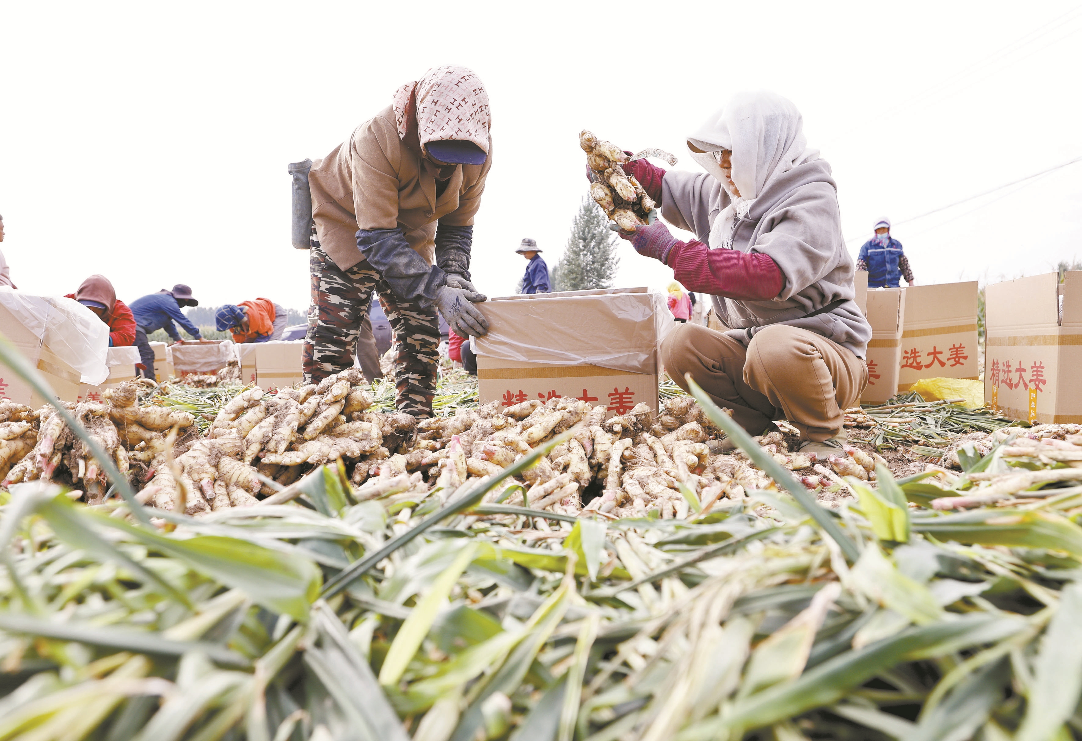 近日,河北省唐山市丰南区的生姜迎来收获季,田间一派繁忙景象。当地政府引导农民因地制宜发展生姜种植,借助规范化、标准化管理,有效提高生姜品质和产量,助力农民增收。