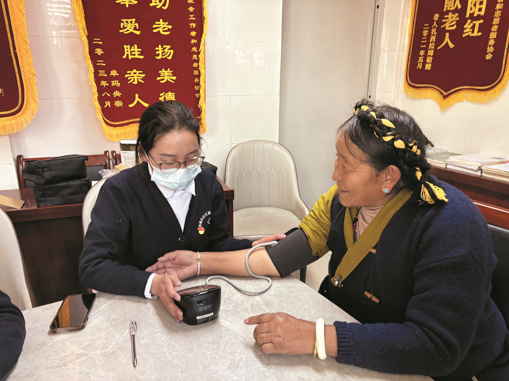 与此同时,城关区蕃阳社会工作者和志愿者服务协会联合西藏自治区第三人民医院,在策门林老年日间照料中心开展了“情暖重阳·健康护航”主题活动。活动在工作人员热情洋溢的《牧人拽步舞》中开场。随后的义诊环节,医护人员耐心为老人提供血压测量、健康咨询、用药指导等服务,并免费发放了价值9000余元的常用药品。医护人员索郎德吉表示,希望通过此次活动切实守护好老人健康,并送上节日祝福。紧接着,趣味包饺子比赛热闹举行,老人们分组协作,现场欢声笑语,洋溢着幸福和谐的温馨氛围。老人央金说:“今天检查了身体,跳了舞,还包了饺子,非常开心,感谢社会的关爱。”此次活动将民族文化、健康关怀与情感慰藉深度融合,是践行“老有所学、老有所乐、老有所为、老有所养”服务理念的生动体现。