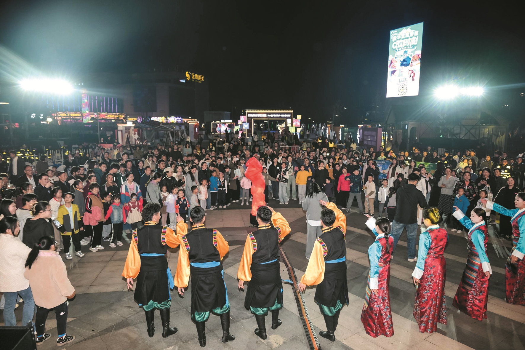 10月31日晚,第六届“格桑花开 南京墨竹周”核心活动——“茉莉格桑共芬芳”专场晚会暨万人锅庄晚会,在南京栖霞区仙林金鹰湖滨天地广场举行。 图为万人锅庄晚会现场。 拉萨融媒通讯员 德吉卓嘎摄
