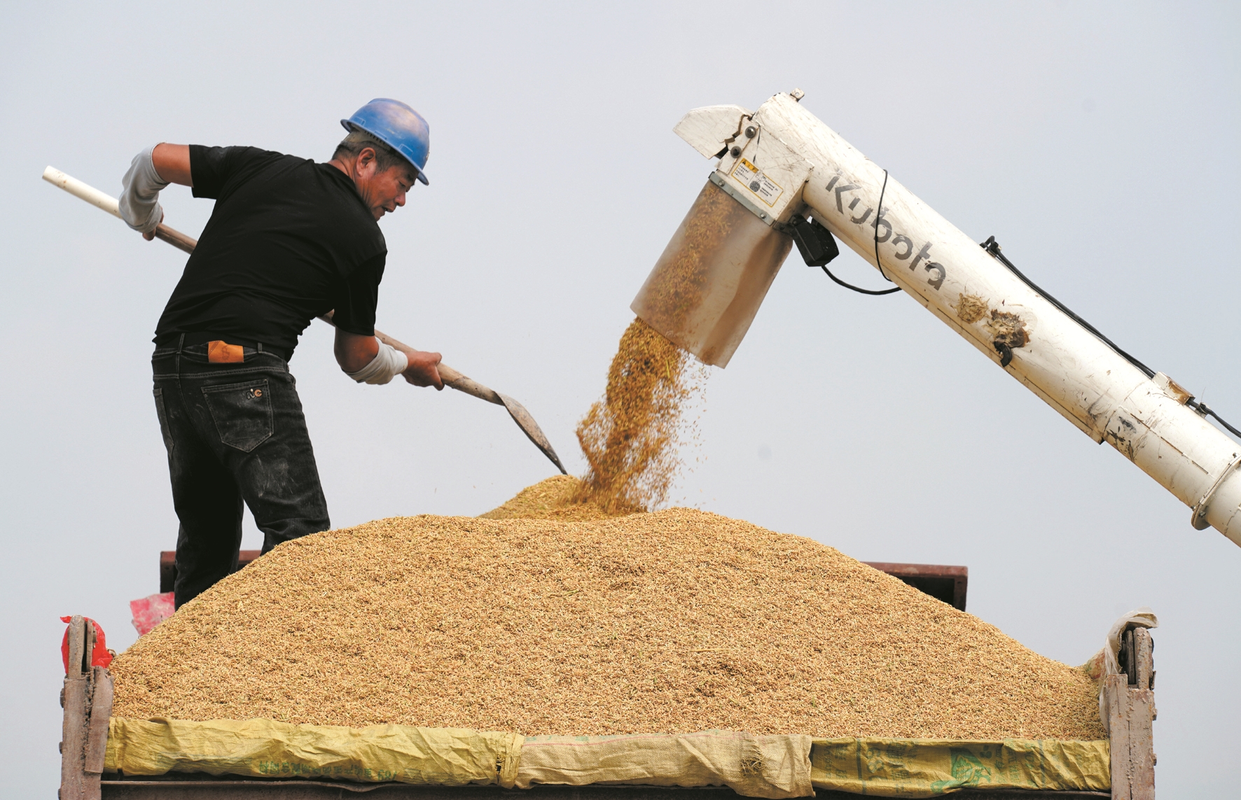 这是11月2日,农民在浙江省乐清市城东街道农田里将收割的稻谷装车。(新华社发)