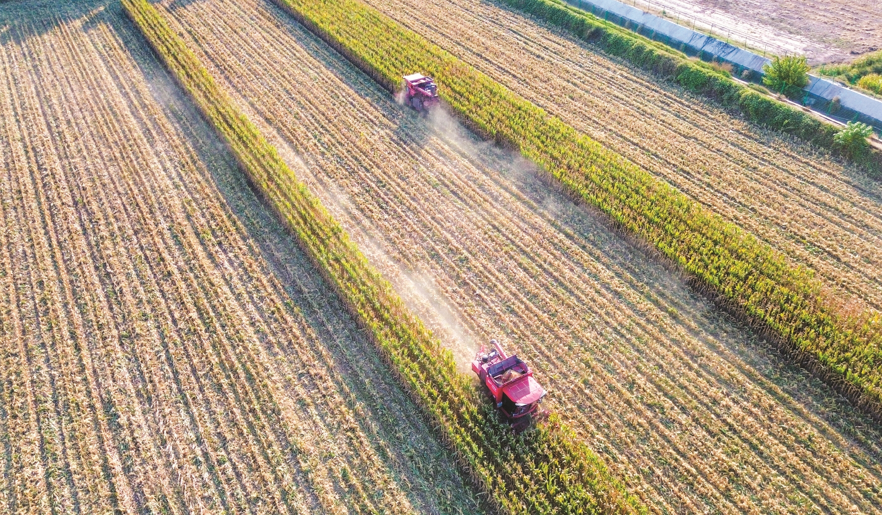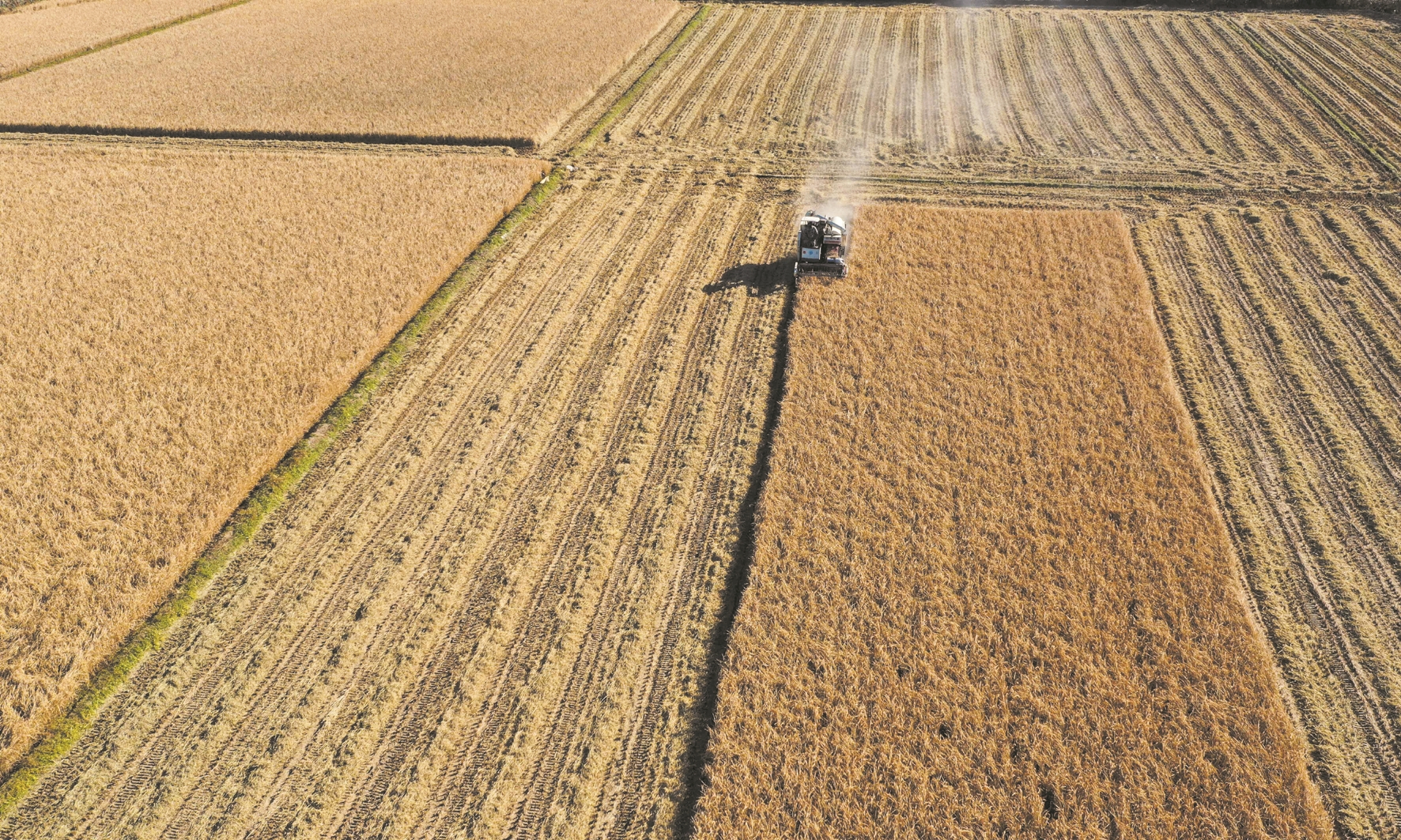 深秋时节,各地农民抢抓农时加紧收获,处处是喜人的秋日好“丰”景。 ▼这是11月2日,河北省遵化市团瓢庄镇山里各庄村农民驾驶农机收获水稻(无人机照片)。 (新华社发)