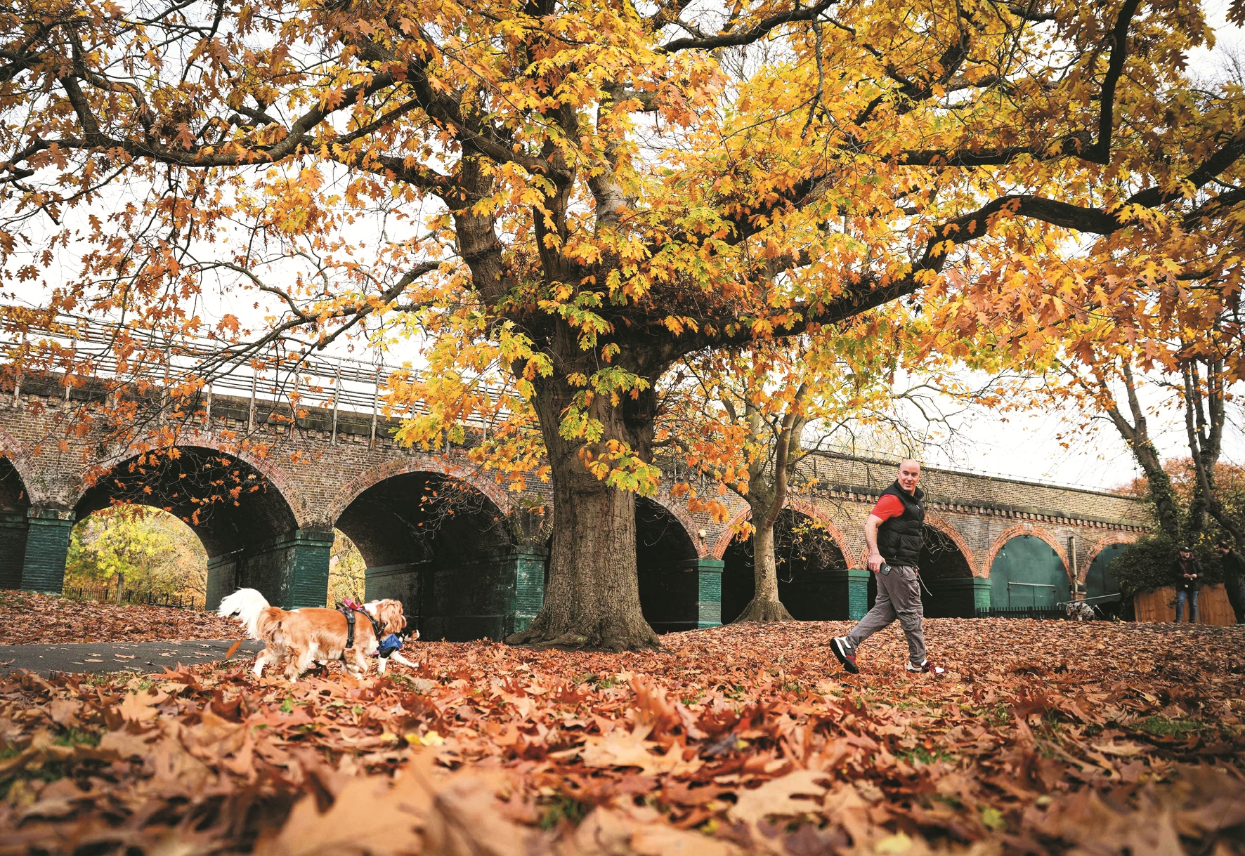 11月3日,一名男子在英国伦敦的公园里和宠物狗玩耍。