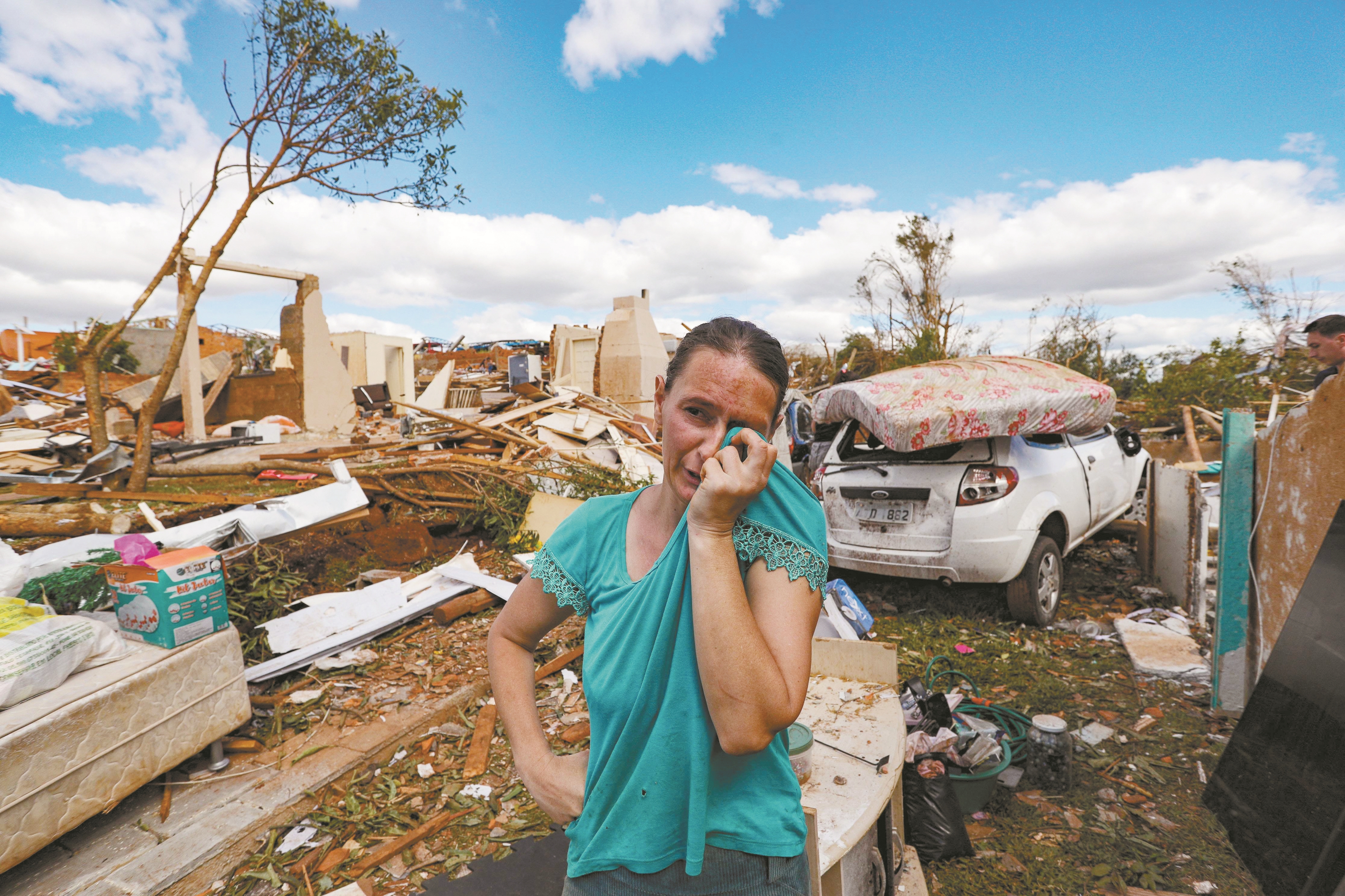 图为11月8日,在巴西南部巴拉那州的里奥博尼图杜伊瓜苏,一名女子站在废墟旁哭泣。(新华社发)
