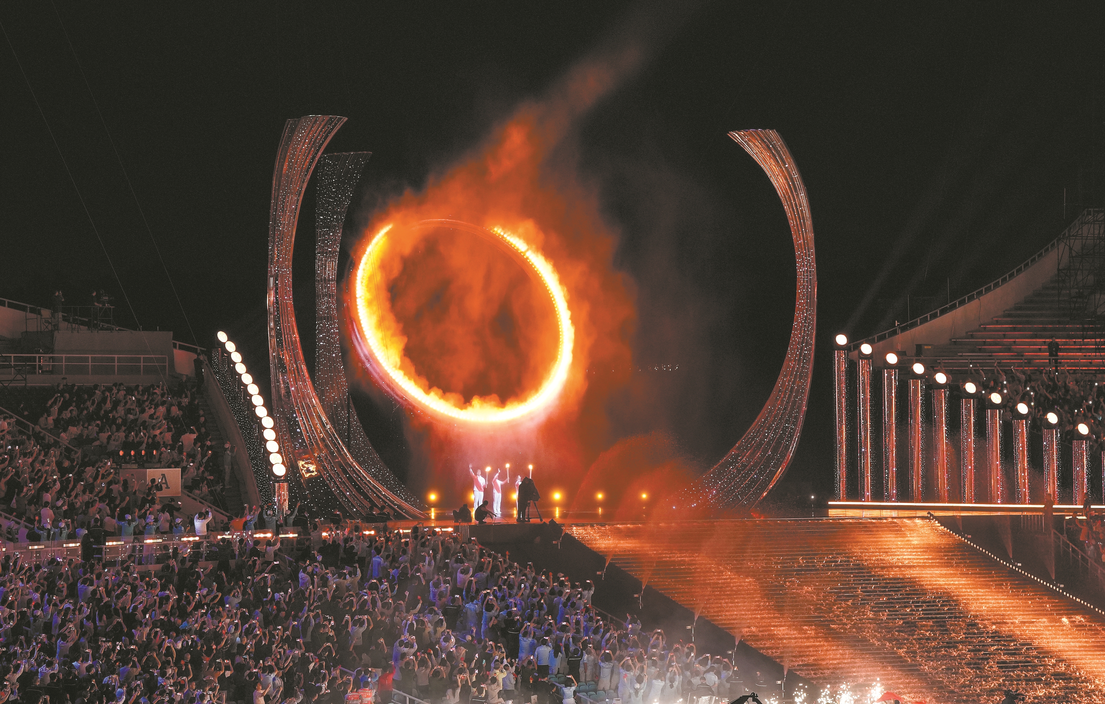 引天之光,燃海之火。沉睡亿万年的“深海之冰”化作跃动的“同心之火”,载人飞行器载着火炬翱翔于湾区天际。粤港澳三地健儿共同点亮主火炬,“同心圆”辉映中国梦,华夏儿女并肩携手,共赴未来。
