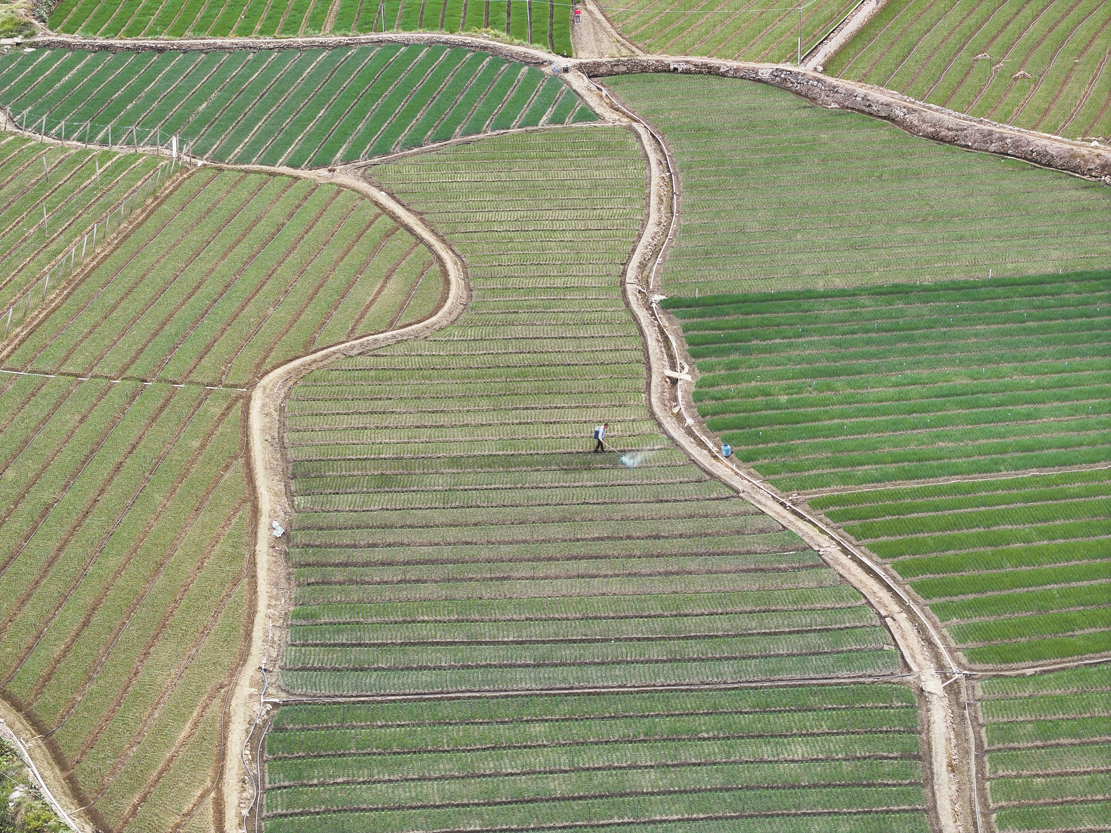 图为柳州市柳江区三都镇觉山村村民在田间管护香葱(无人机照片,11月11日摄)。