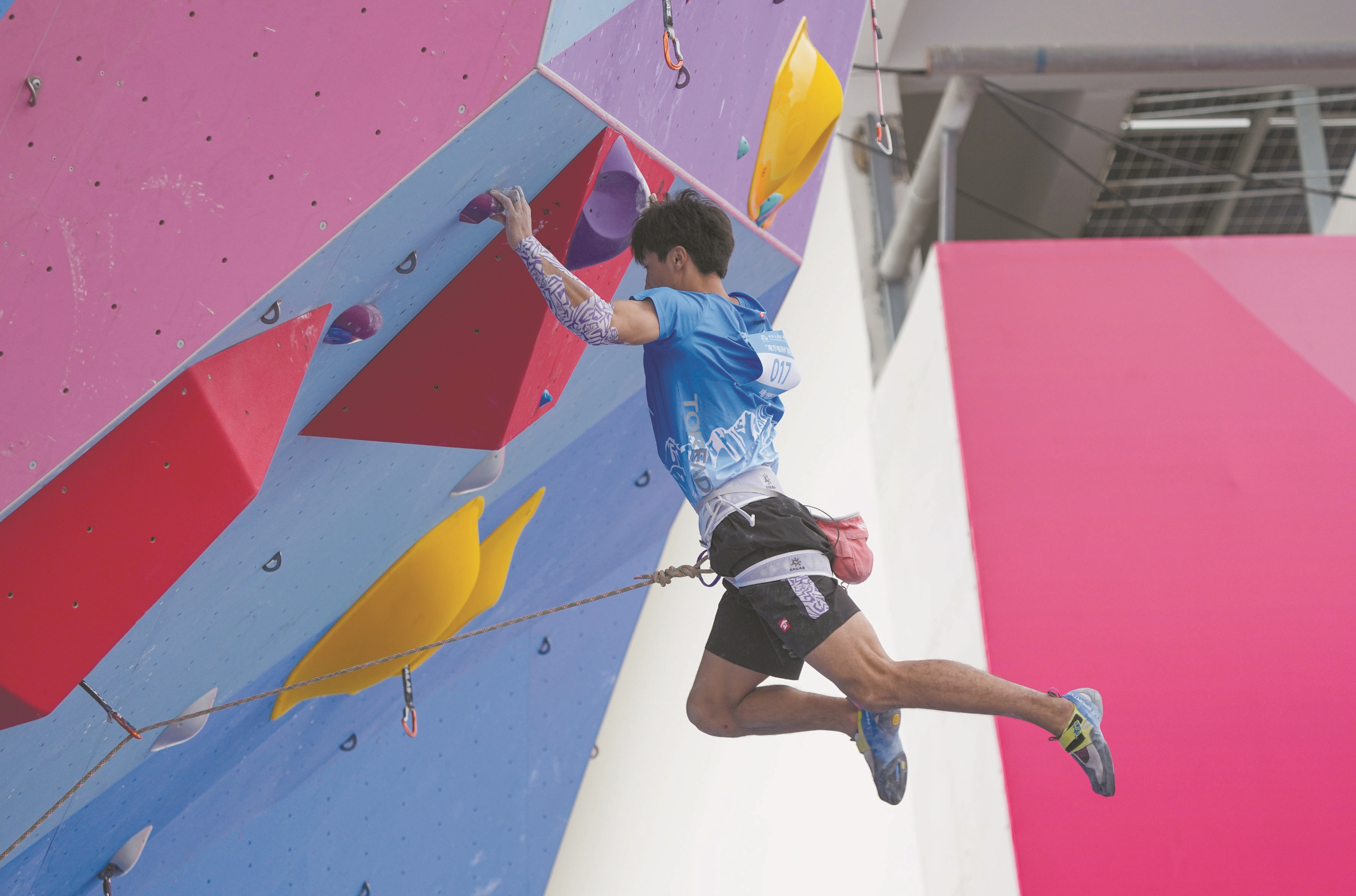 11月12日,第十五届全国运动会攀岩项目男子难度预赛在广州举行。 ▲这是当日西藏队选手强巴平措在比赛中。 (新华社发)