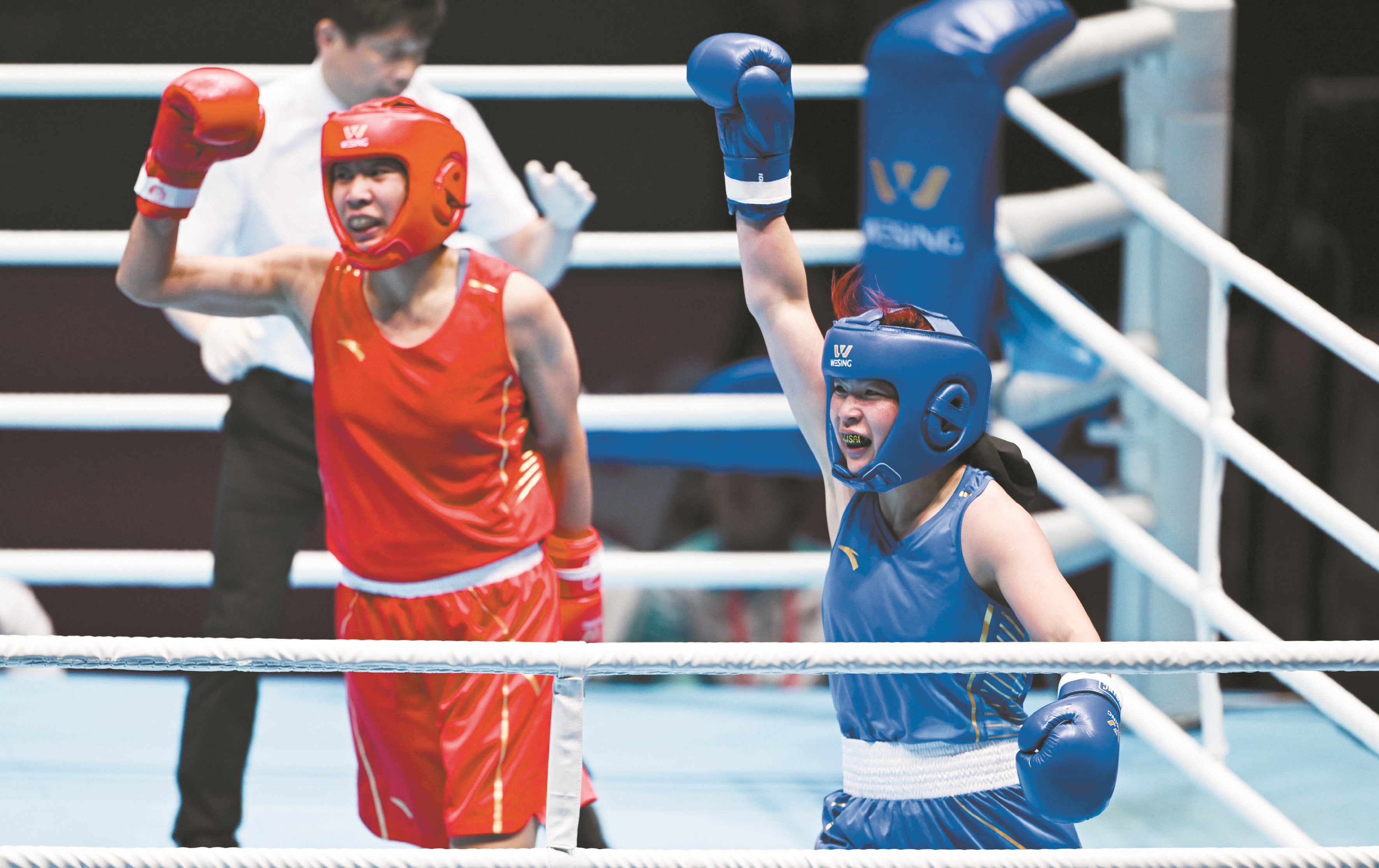 11月12日,在深圳进行的第十五届全国运动会拳击女子66公斤级决赛中,北京体育大学队选手禹立赛战胜河南队选手李书,获得冠军。 ▲这是当日禹立赛(右)在比赛结束后庆祝。(新华社发)