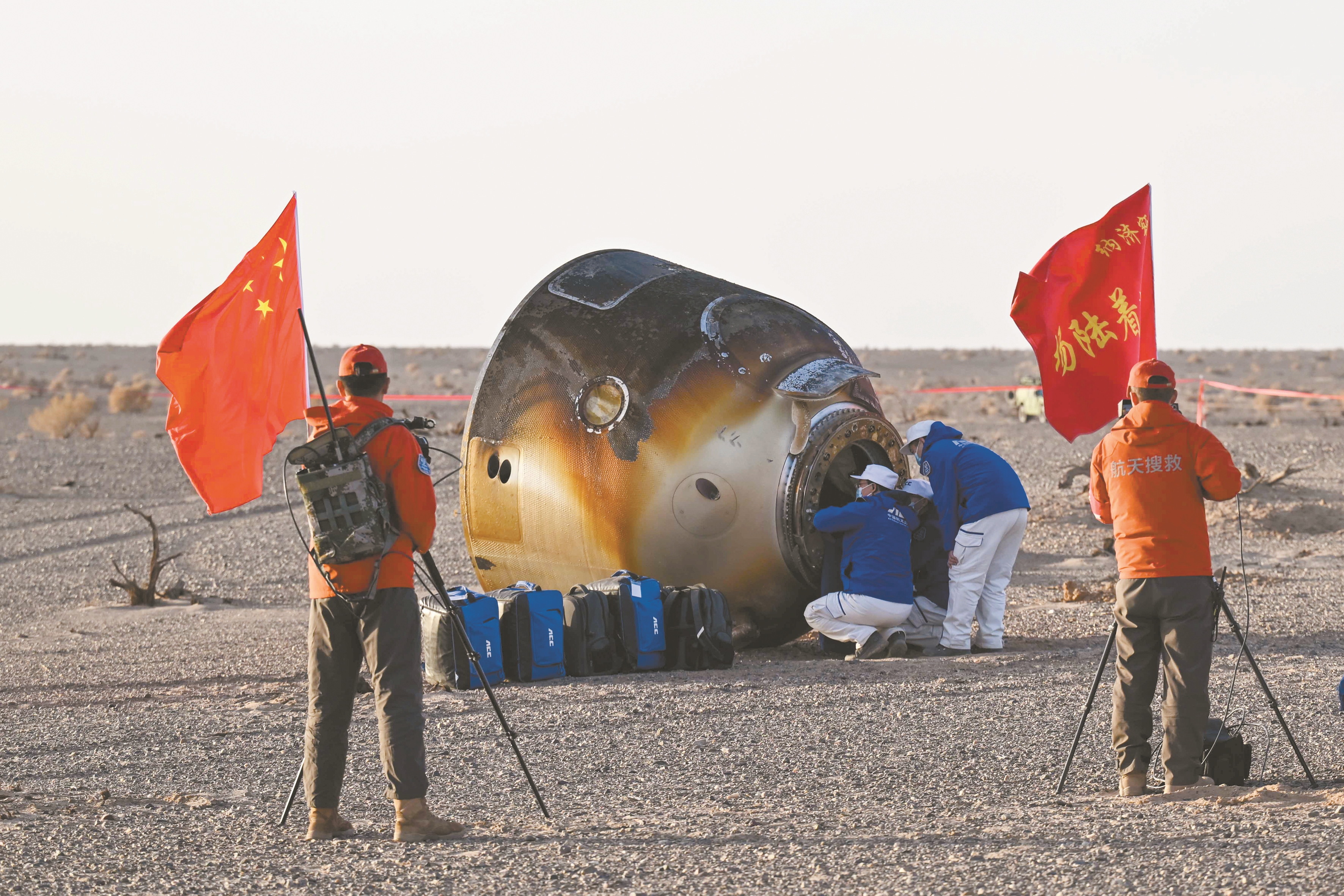 14日16时40分,神舟二十一号载人飞船返回舱在东风着陆场成功着陆。返回舱舱门打开后,神舟二十号航天员陈冬、陈中瑞、王杰安全顺利出舱,健康状态良好。