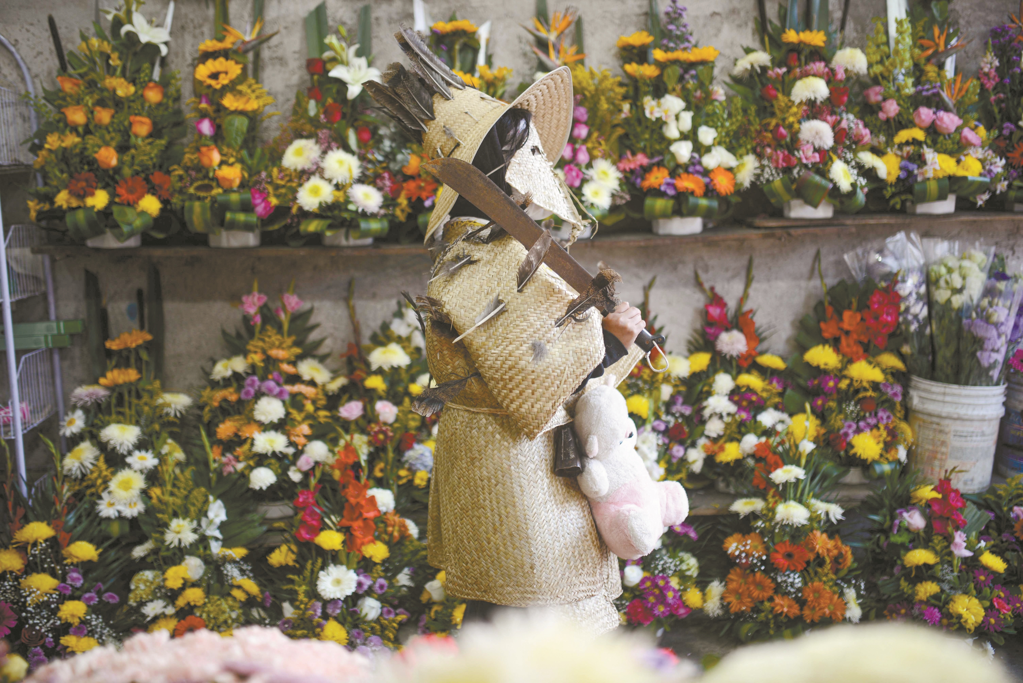 ↑↗这是11月14日,在墨西哥科斯科马特佩克-德布拉沃举行的全国面具舞节上,一名表演者展示自己的面具。(新华社发)
