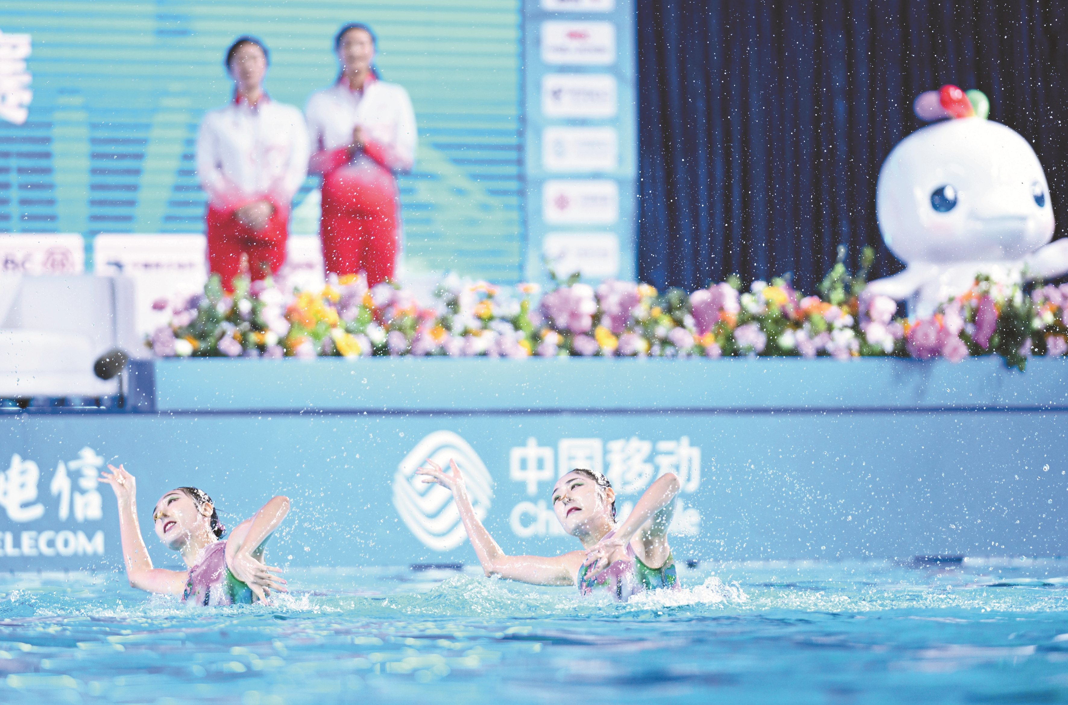 11月15日,第十五届全国运动会花样游泳女子双人技术自选比赛在广东江门举行。 ▲这是当日,广东队组合王柳懿/王芊懿在比赛中。该队获得女子双人技术自选小项第1名。 新华社记者 陈钟昊摄