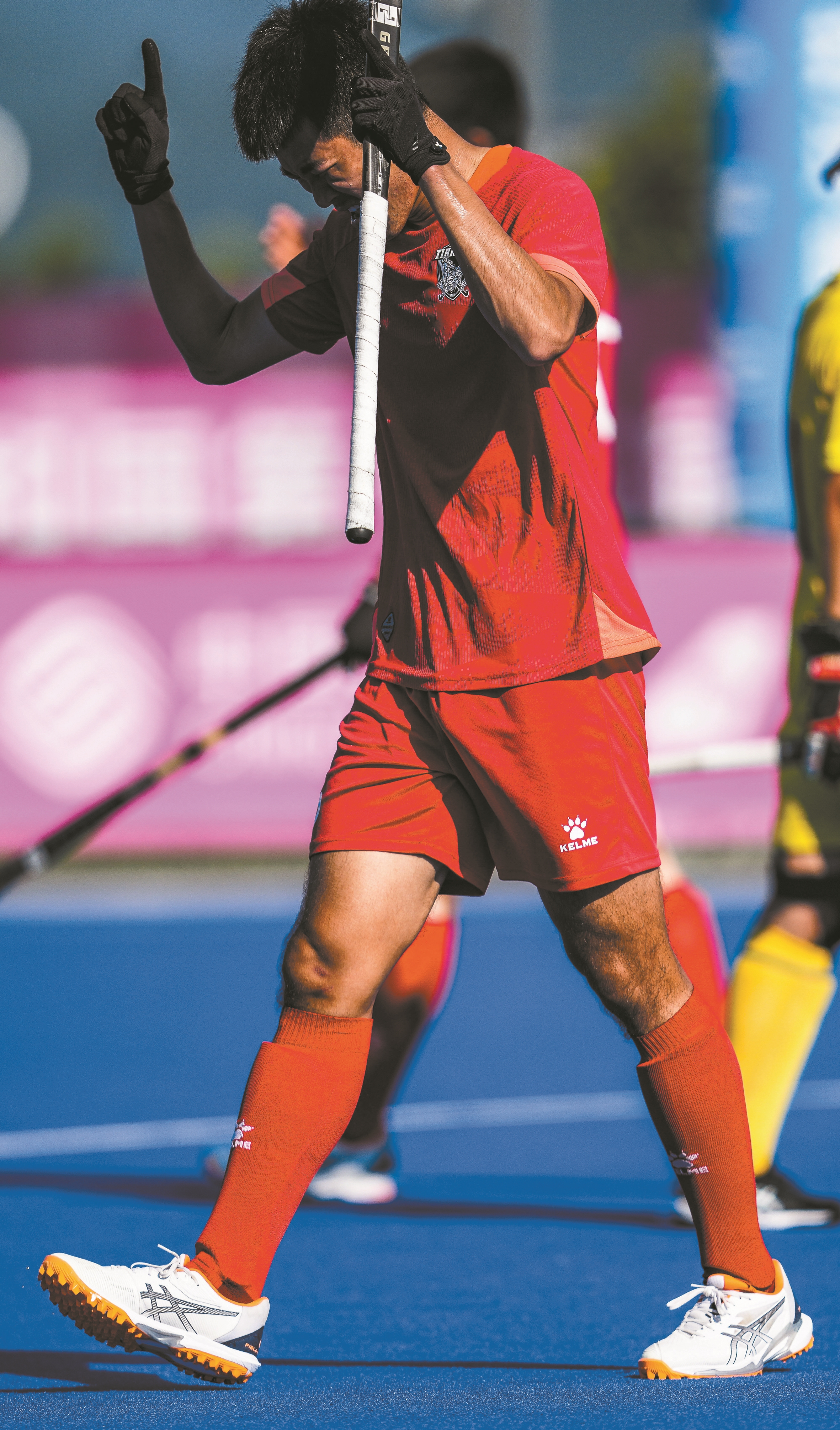 ?十一月十五日,在广东云浮举行的第十五届全国运动会曲棍球项目男子七-八名次赛中,天津队三比二战胜江苏队。 这是当日,天津队球员王洪博在比赛中庆祝进球。新华社记者 陶 亮摄