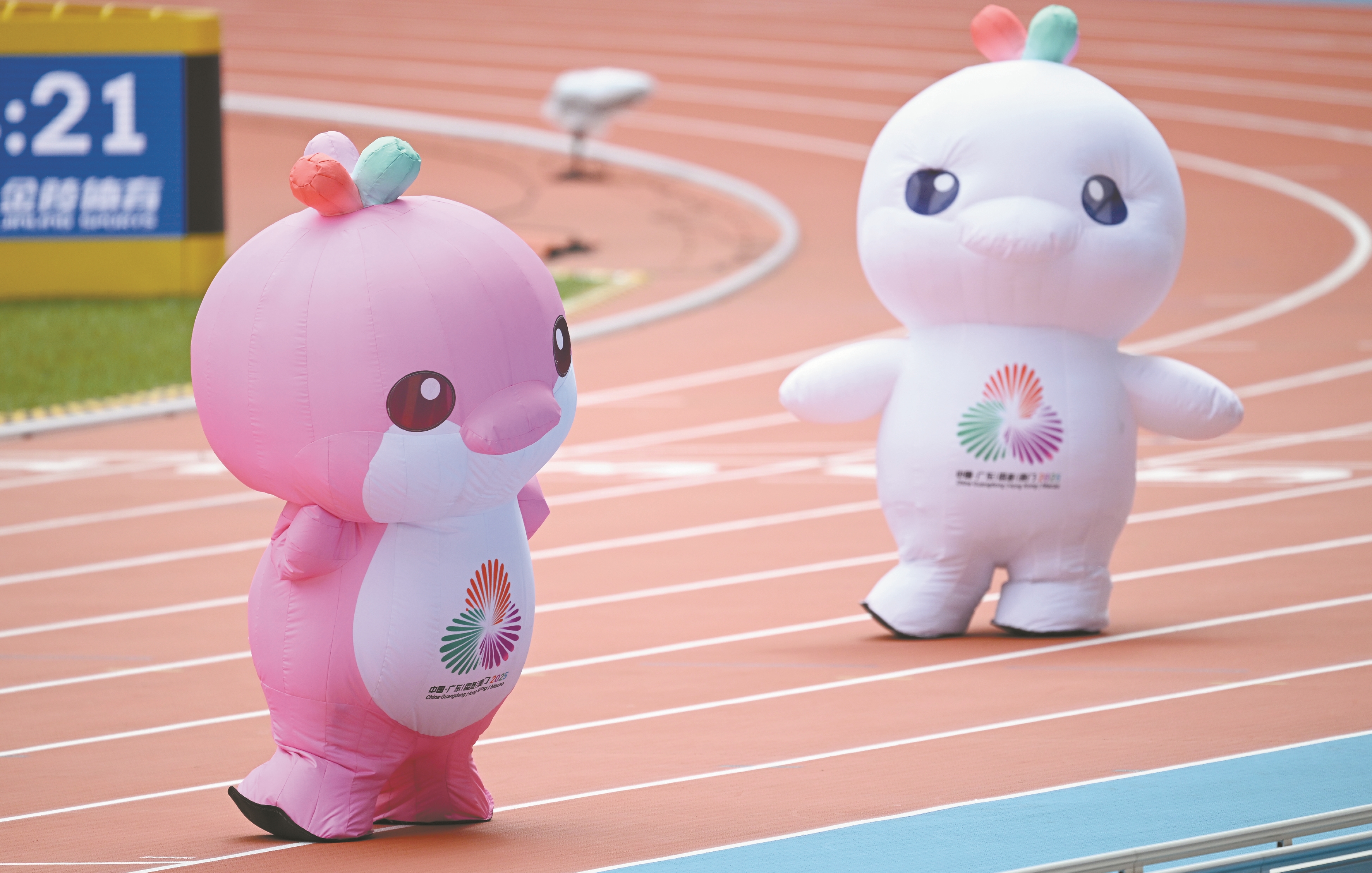11月15日,第十五届全国运动会田径项目在广州开赛。 ▲这是当日,吉祥物“喜洋洋”和“乐融融”在比赛间隙表演。 新华社记者 邓 华摄