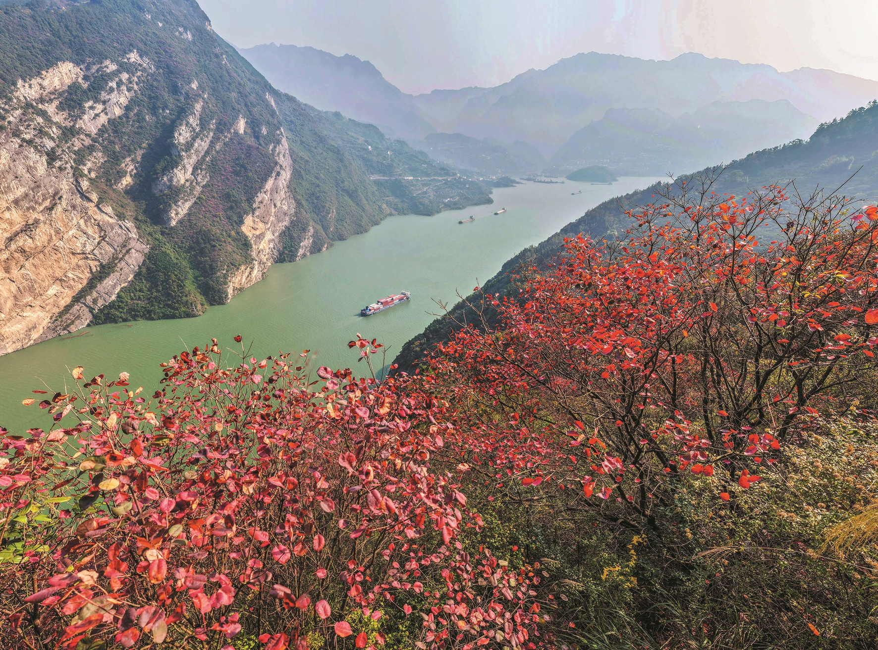 图为11月16日,船舶行驶在湖北省宜昌市秭归县西陵峡水域(无人机照片)。(新华社发)