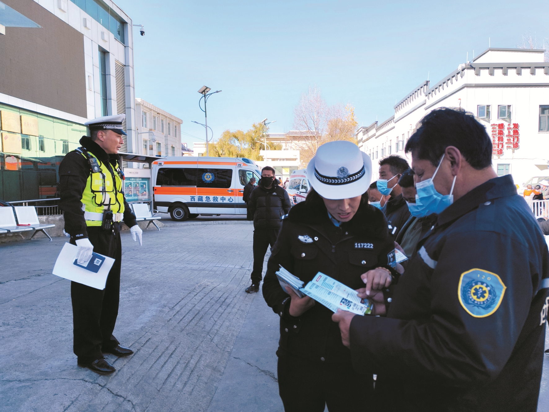 图为拉萨市公安局交通管理支队民警为自治区120急救中心驾驶员宣讲并发放宣传资料。 拉萨融媒记者 齐永昌摄