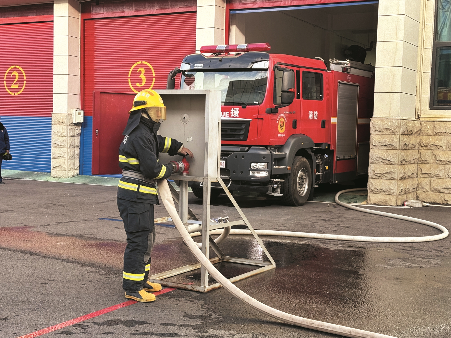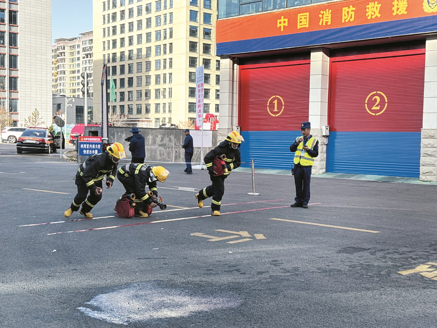 ↑→图为活动现场,队员协作开展“利用室内消火栓快速出水操”比赛。 拉萨融媒记者 拉姆次仁摄