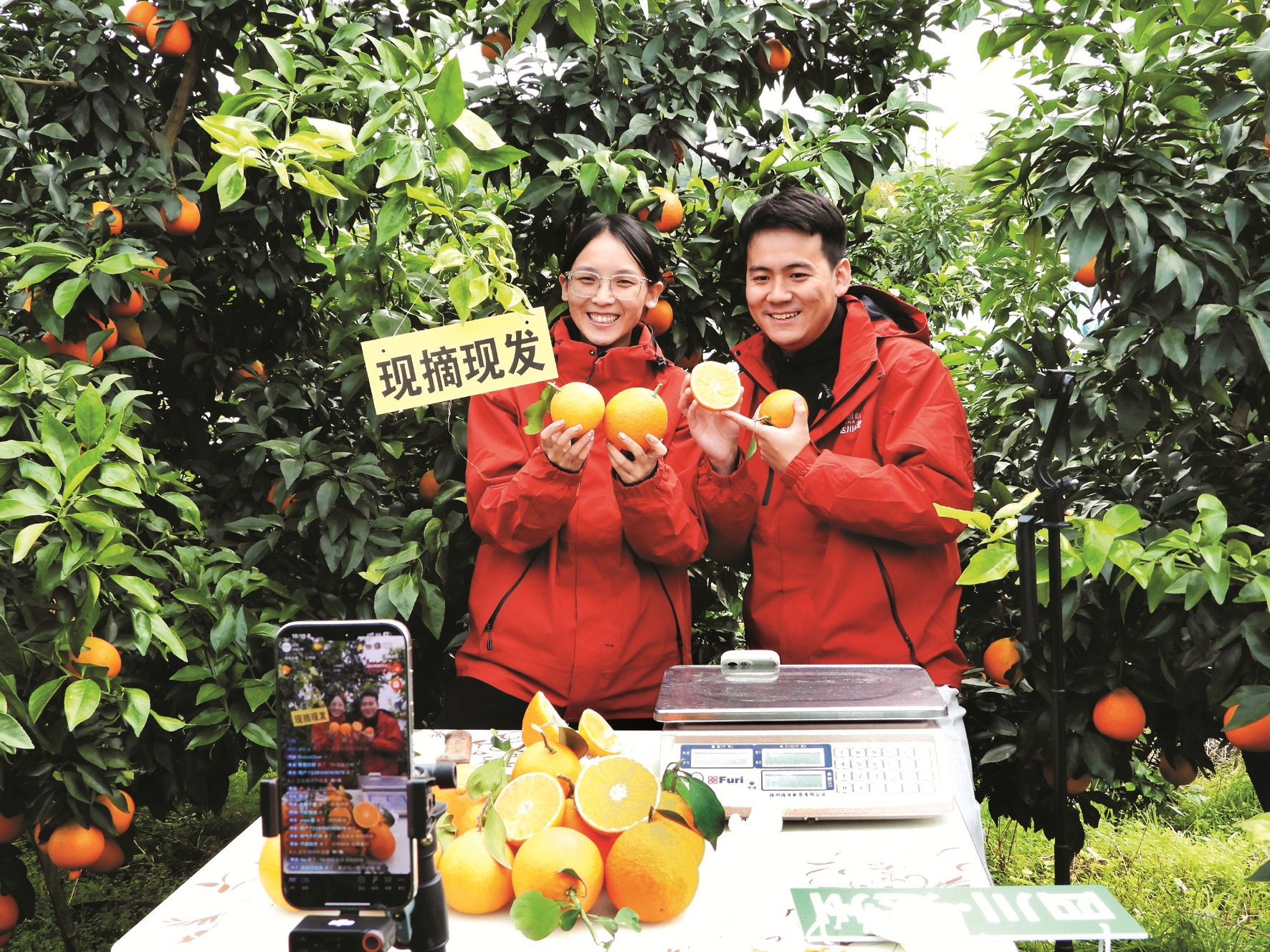 图③为11月18日,在四川省达州市渠县合力镇石燕村柑桔种植基地,工作人员线上直播销售脐橙。 (新华社发)