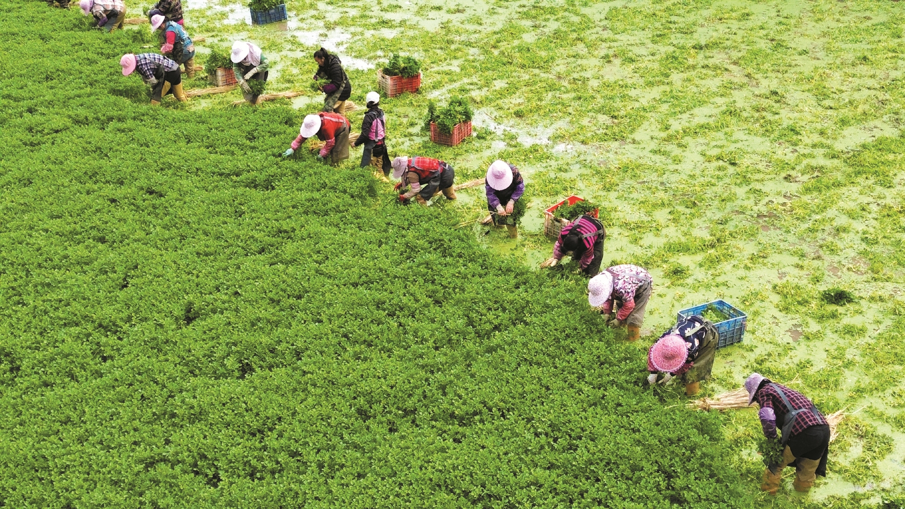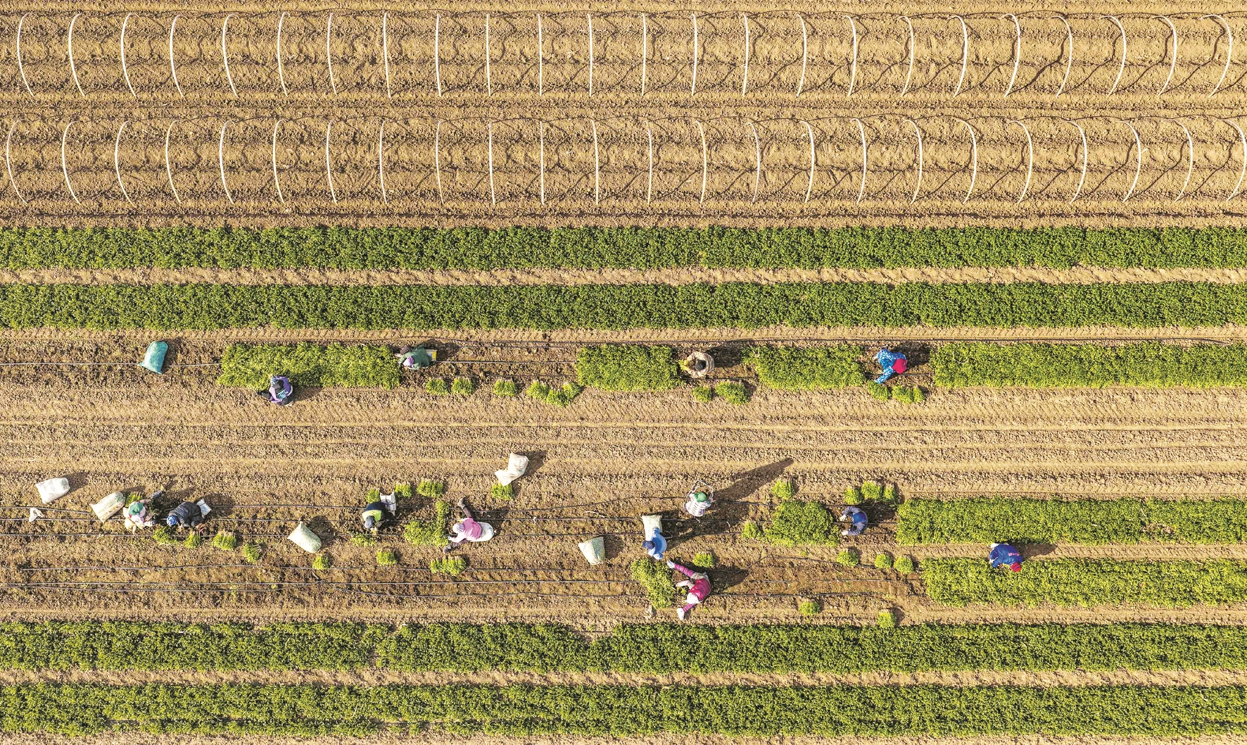 图②为11月18日,河北省唐山市玉田县虹桥镇农民在田间收获香菜(无人机照片)。