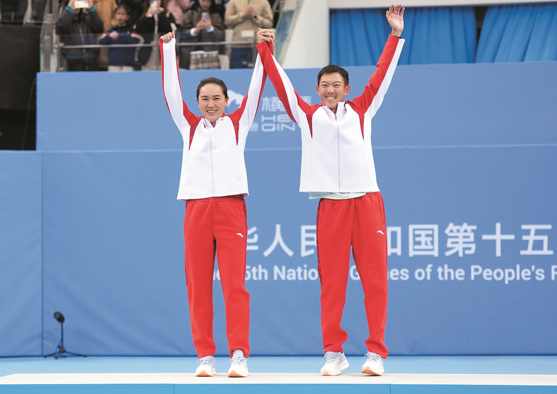 11月20日,第十五届全国运动会网球项目女子单打颁奖仪式在广东横琴举行。 ▲这是当日,获得冠军的安徽队选手朱琳(左)与教练在颁奖仪式上。 新华社记者 颜麟蕴摄