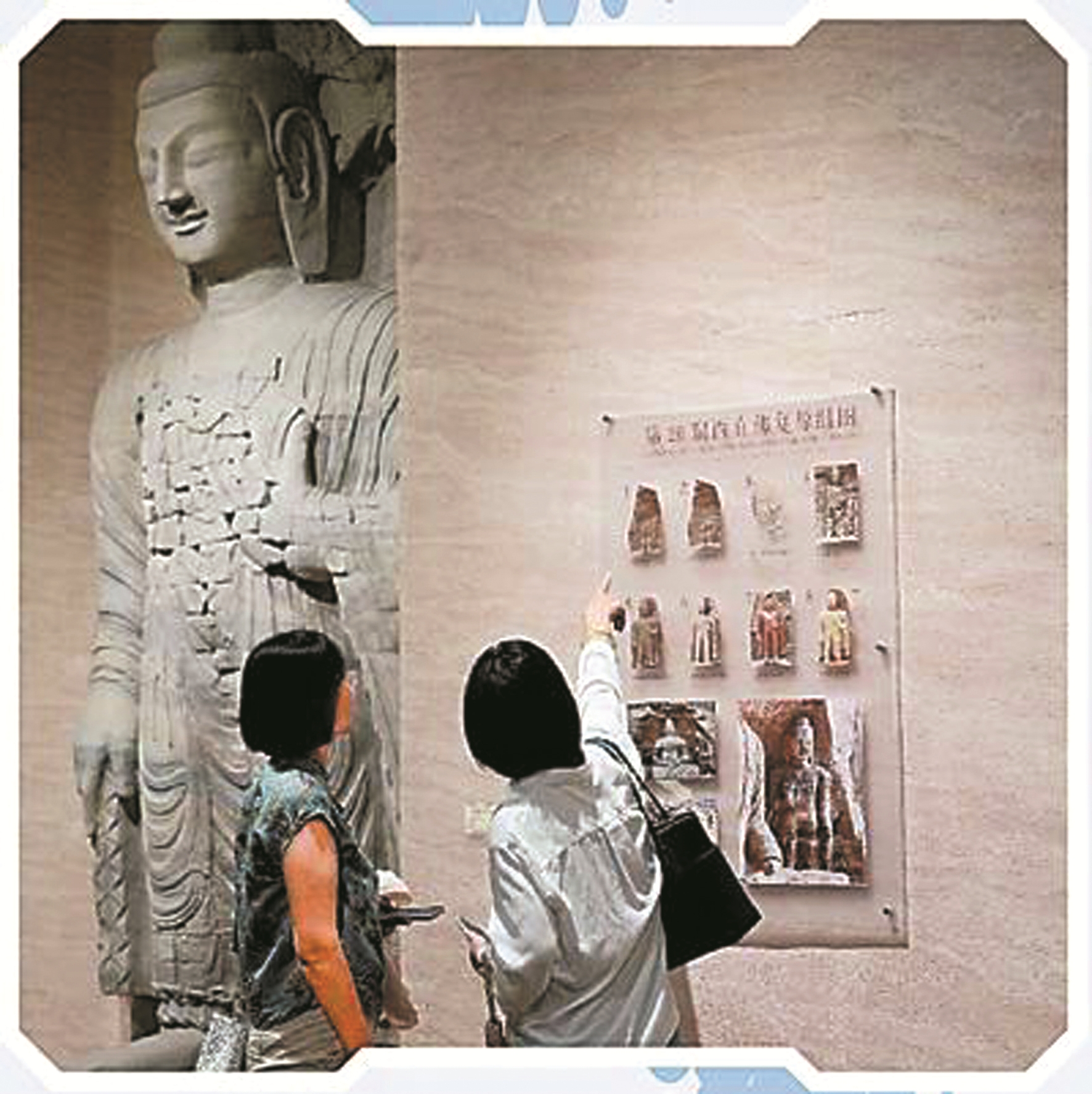 图②:游客在3D打印的云冈石窟第20窟西立佛复原像前游览。