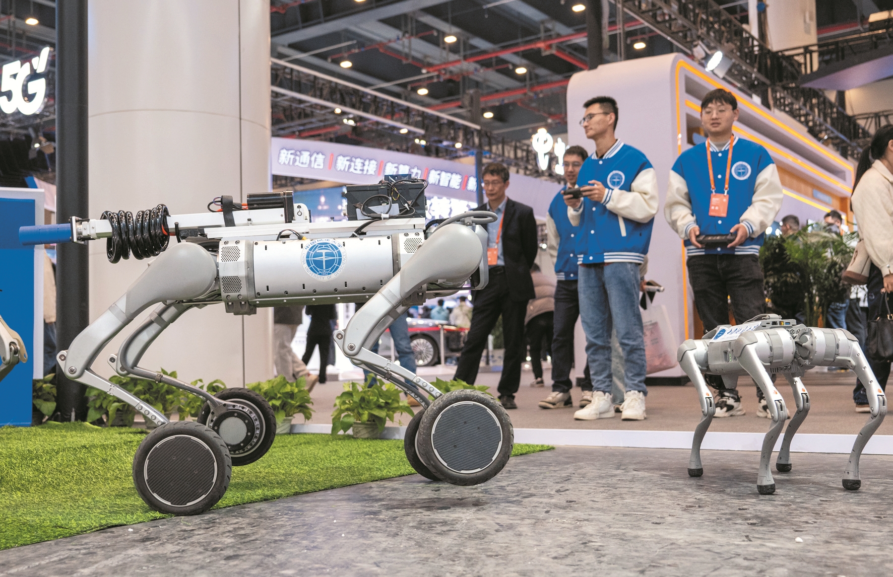 图为11月21日,参观者在2025中国5G+工业互联网大会展厅参观一款踏勘机器狗。