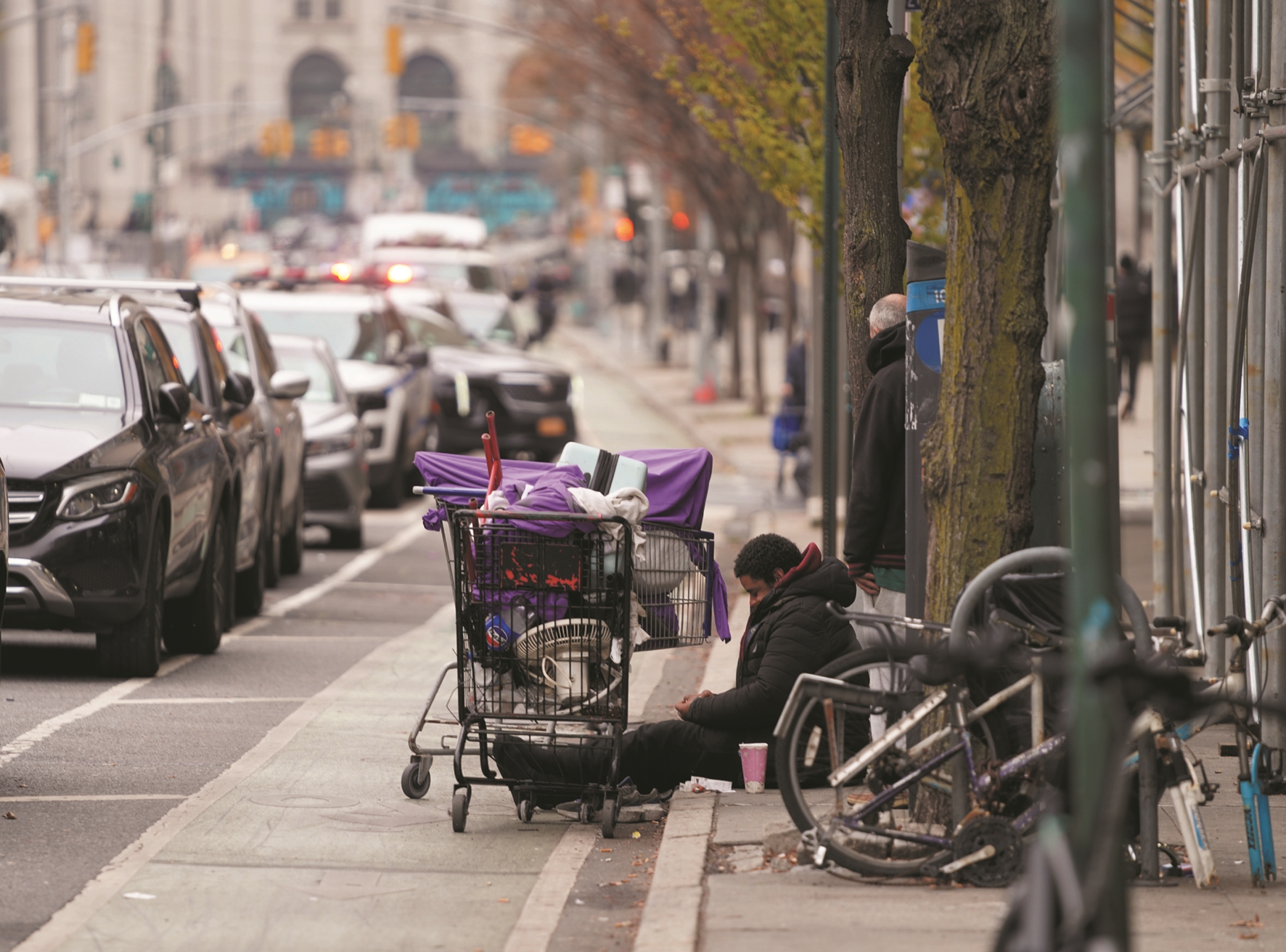 图为11月21日,在美国纽约一处无家可归者救助点附近,一名无家可归者带着行李坐在街头。新华社记者 张凤国摄