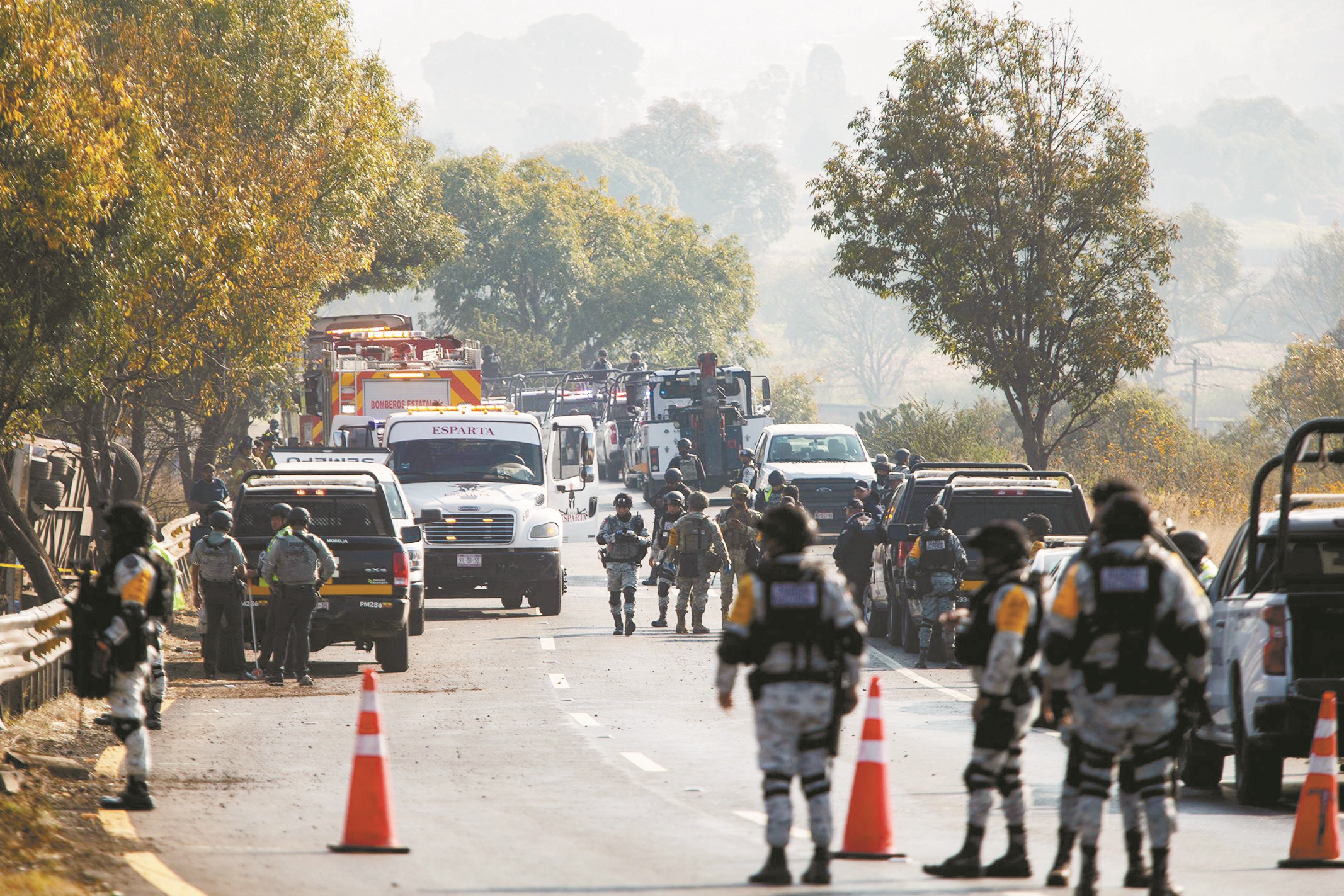 这是11月22日,在墨西哥米却肯州蒂里佩蒂奥附近公路上,应急人员在事故现场开展工作。