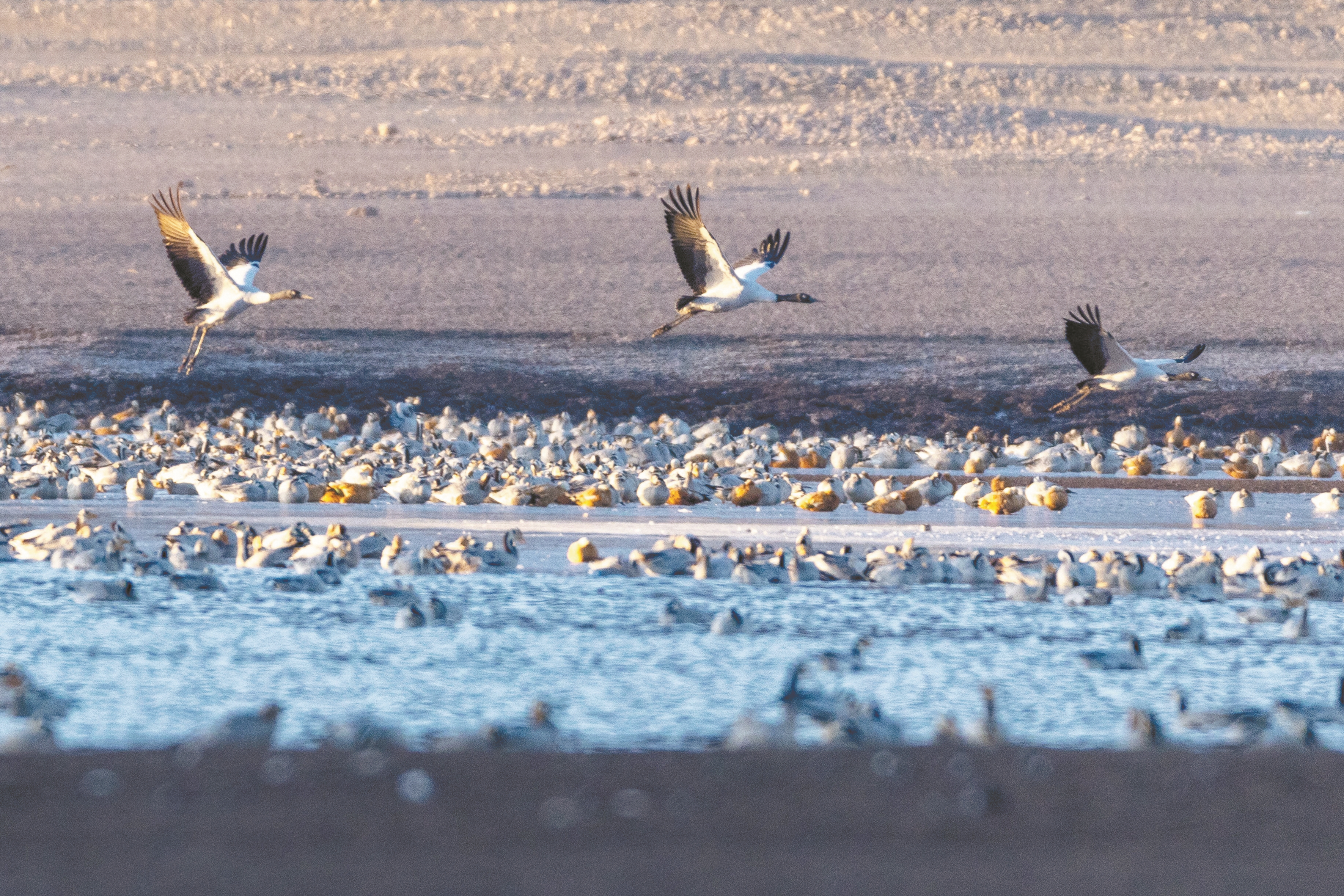 冬日时节,拉萨市林周县迎来大批越冬候鸟,黑颈鹤、斑头雁、赤麻鸭等候鸟在河谷、湖泊等地觅食、休憩。