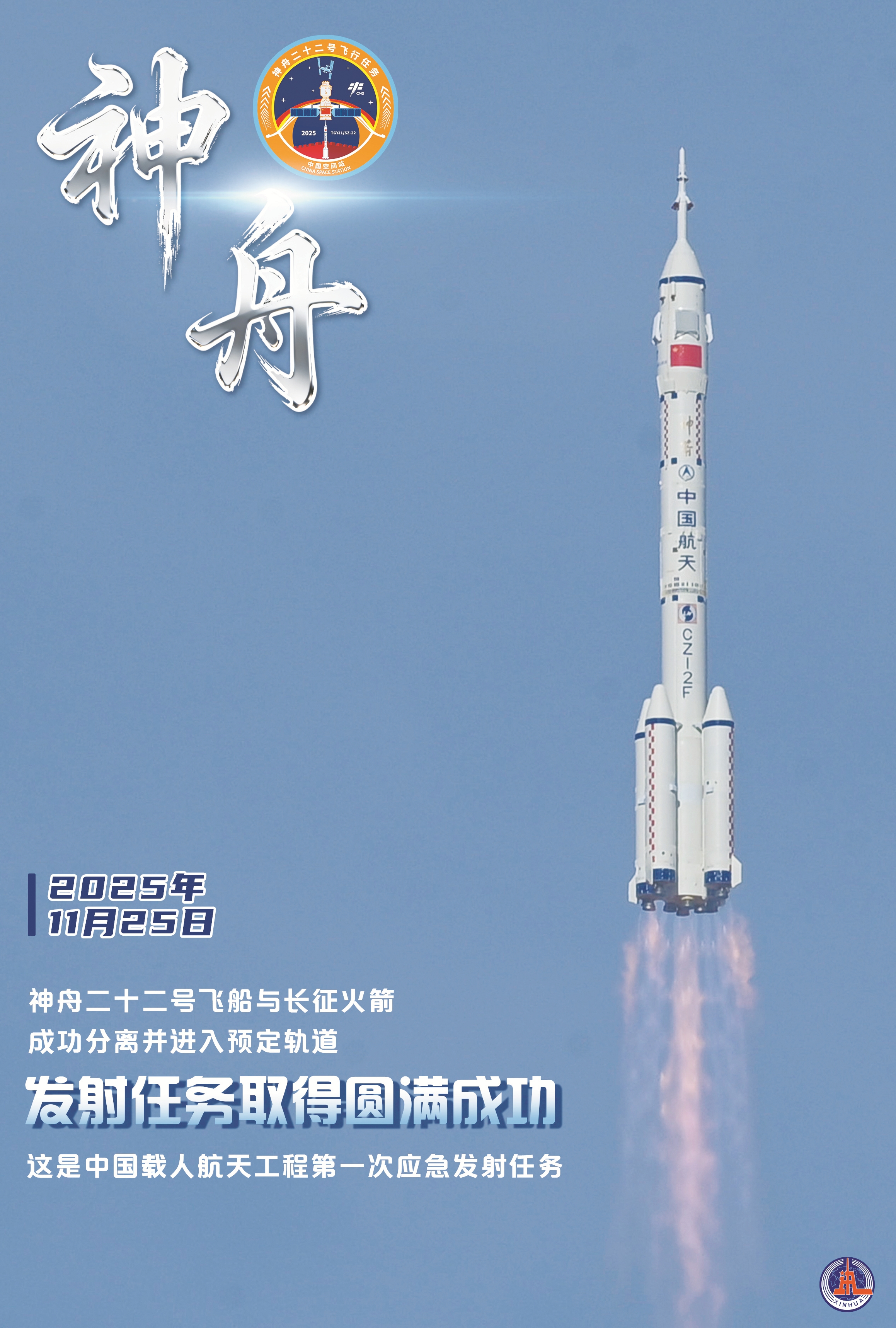 新华社酒泉11月25日电(记者李国利、刘艺)我国于11月25日12时11分成功发射神舟二十二号飞船,中国载人航天工程首次应急发射任务取得圆满成功。