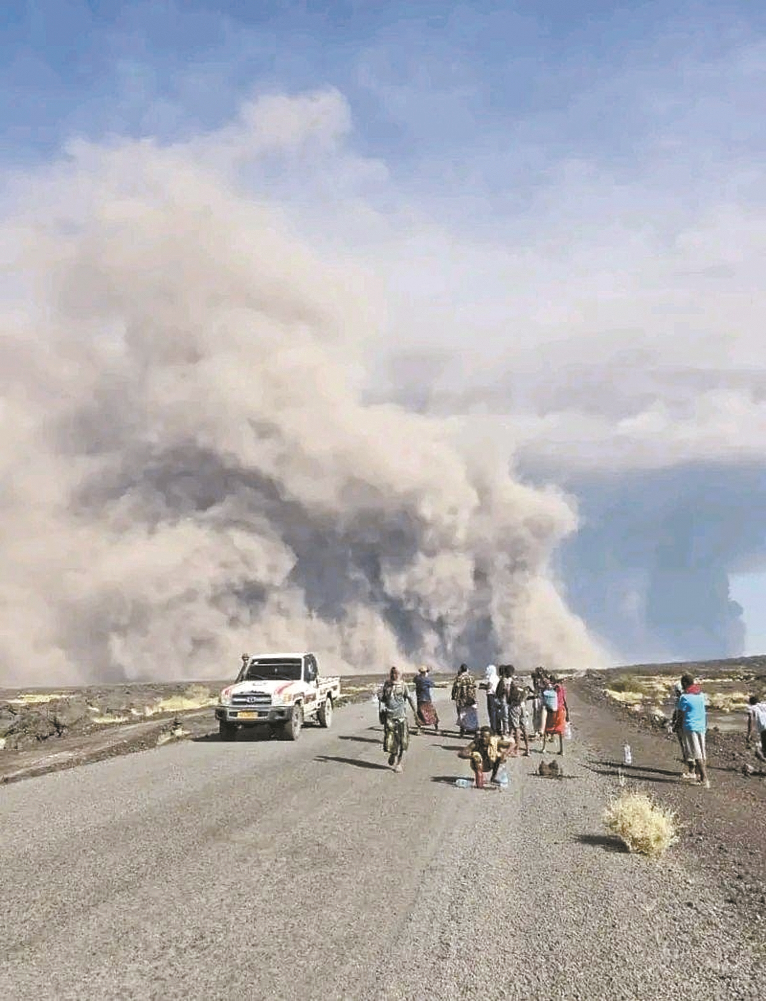 图片均为11月23日,在埃塞俄比亚阿法尔地区,人们观看海利古比火山喷发产生的烟尘。(新华社发)