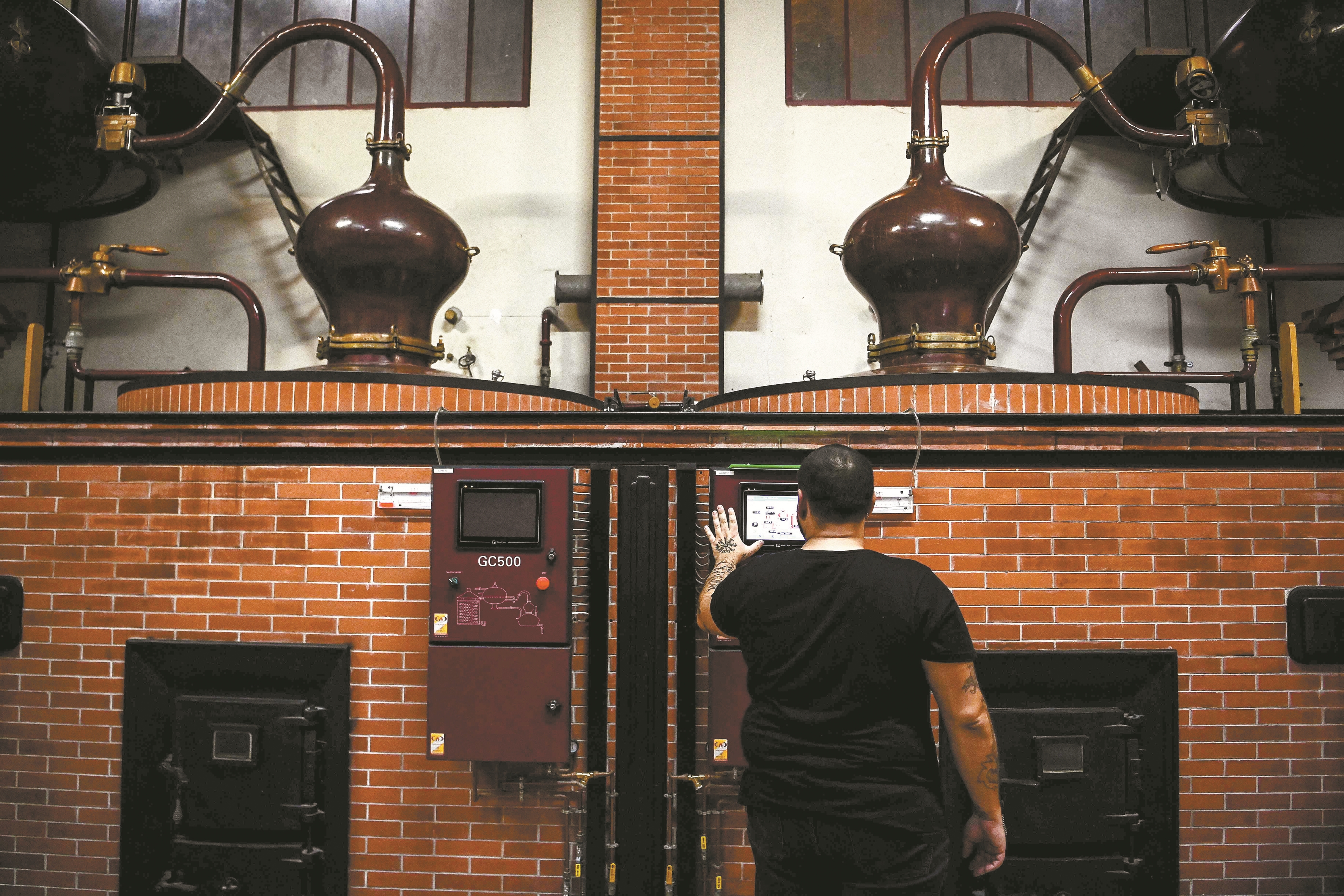 ▲图为11月21日,在法国科尼亚克,一名工人操作酿酒设备。(新华社发)