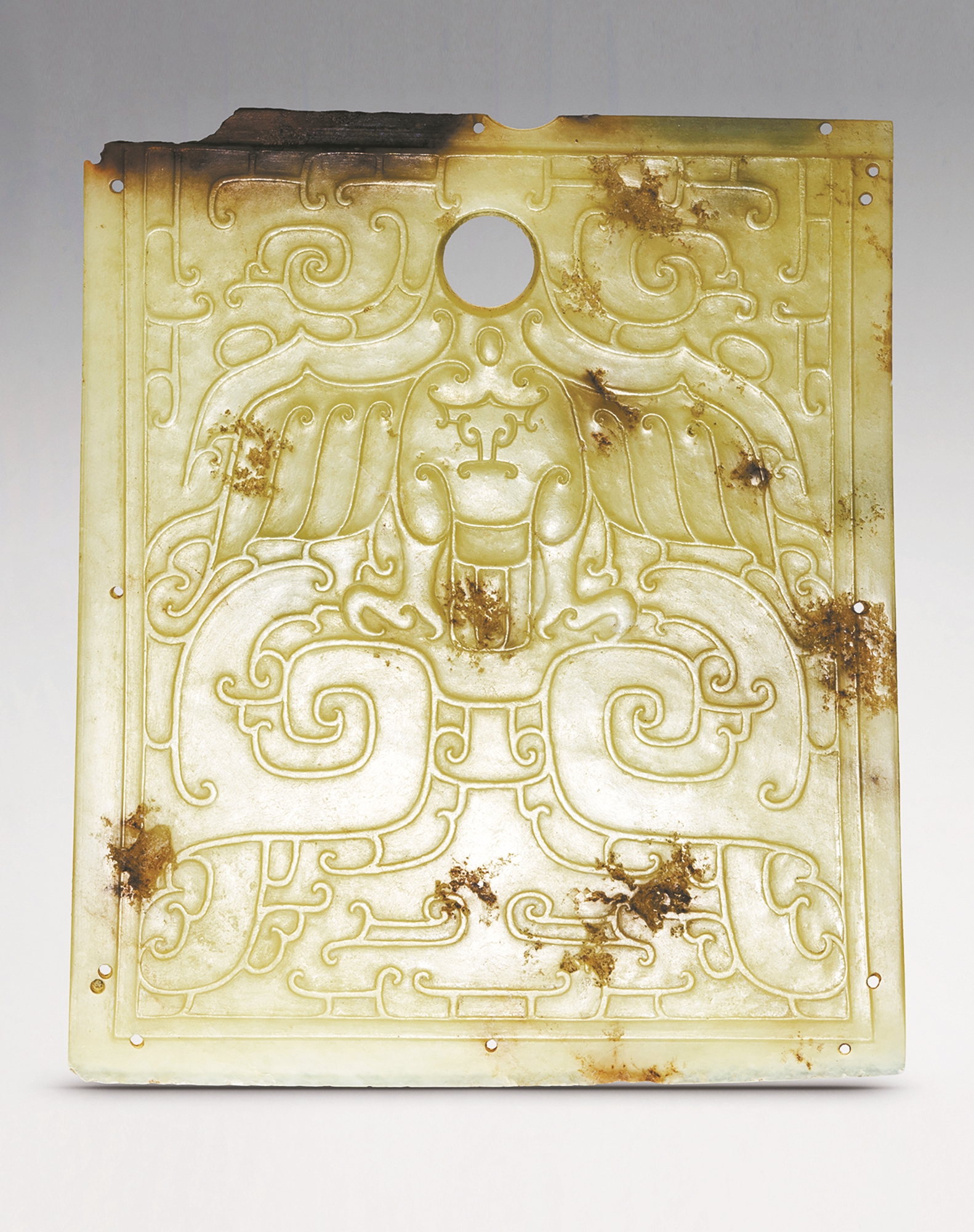 ▲这是陕西榆林石峁遗址墓葬出土的鹰纹玉钺(正面)(资料照片)。
