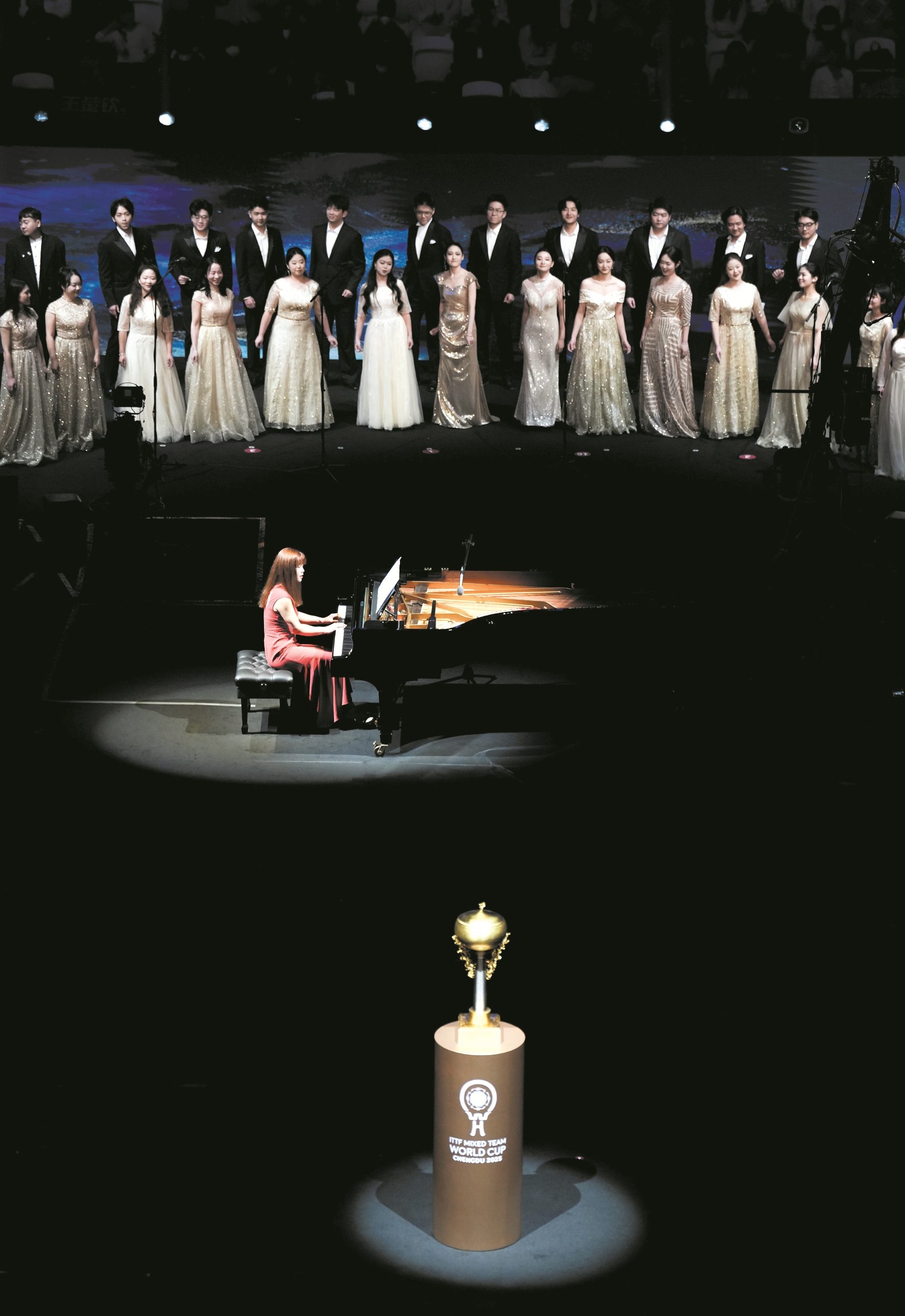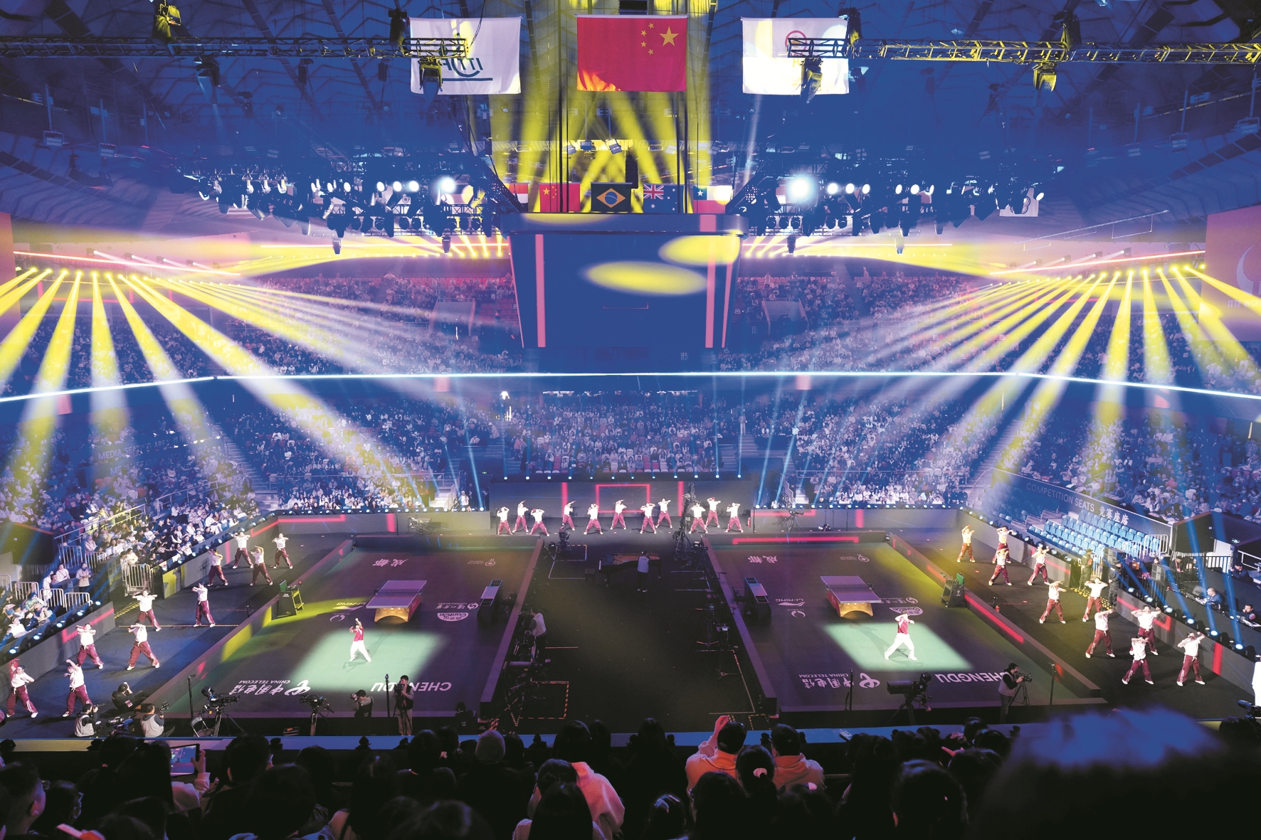 11月30日,2025年成都国际乒联混合团体世界杯开幕式在四川省体育馆举行。 ▲?图为当日,演员在开幕式上表演。 新华社记者 王 迎摄